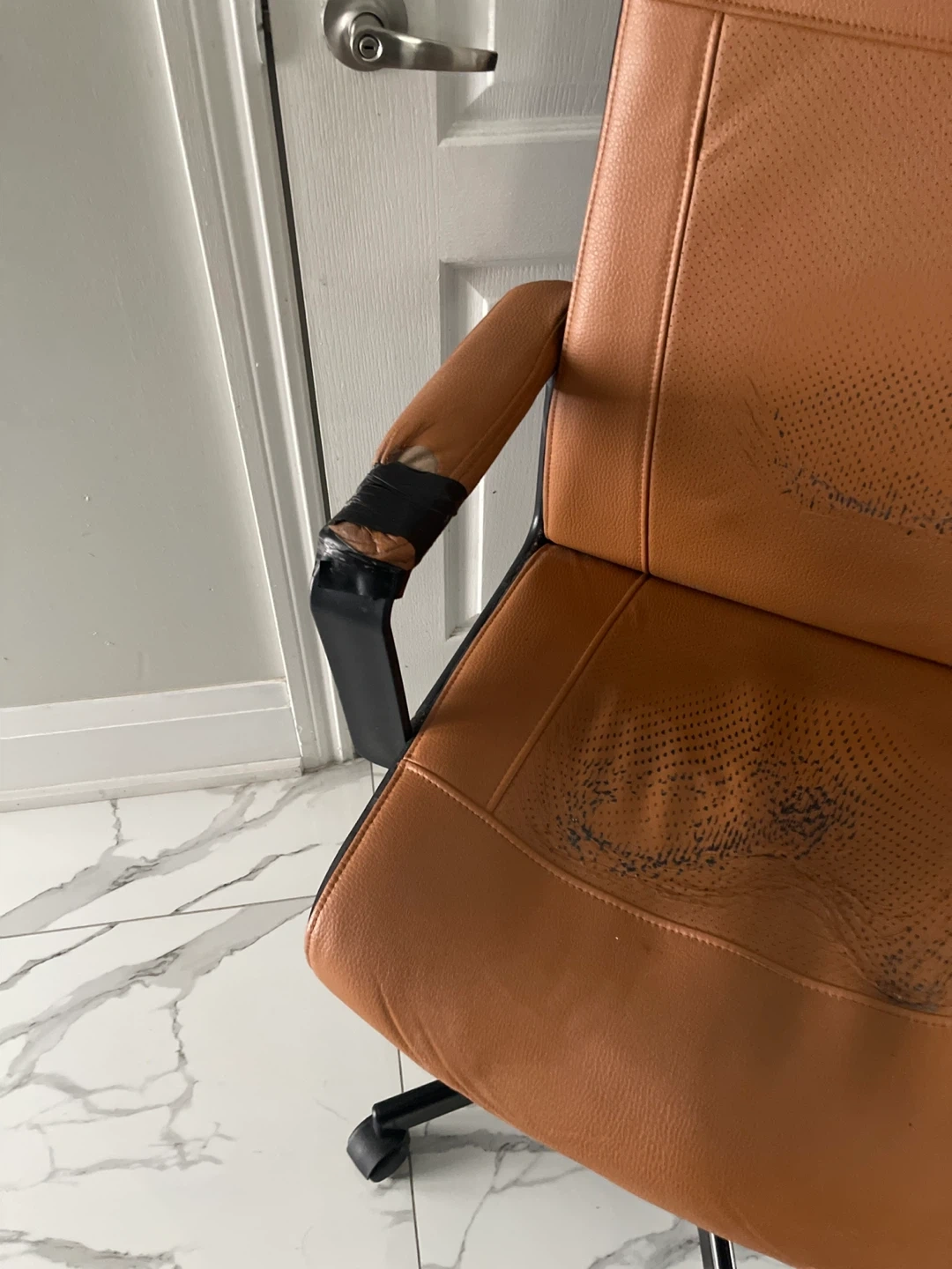 This is a brown office chair with visible wear and tear on the seat and armrests. It's a faux leather material. The armrests have been wrapped with black tape for temporary repair. Still functional for use.