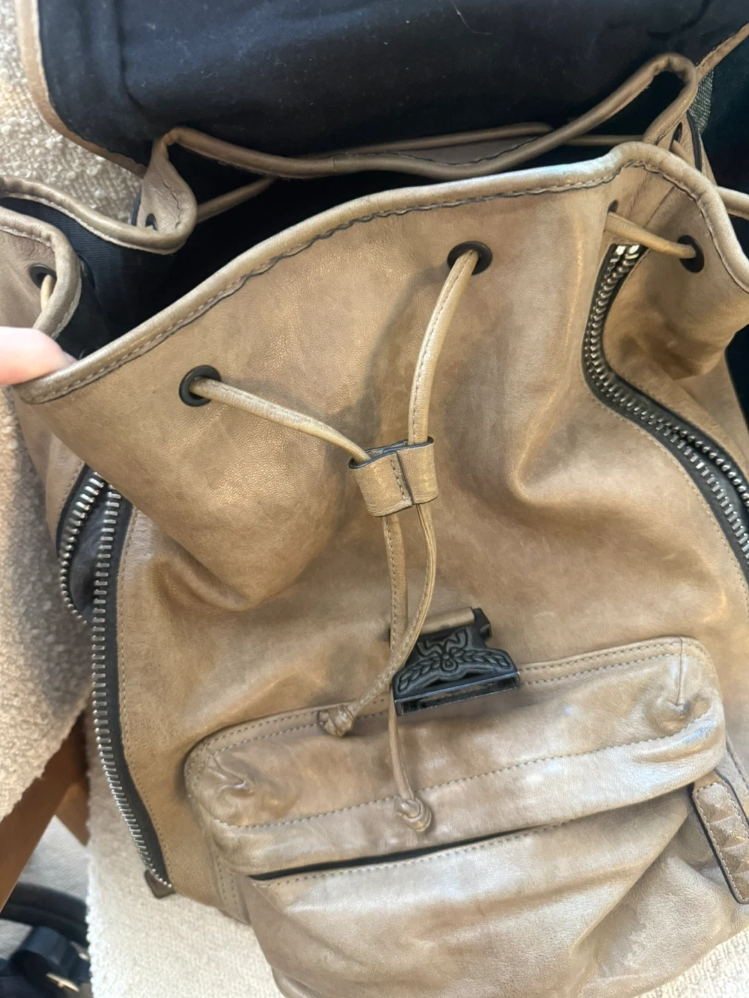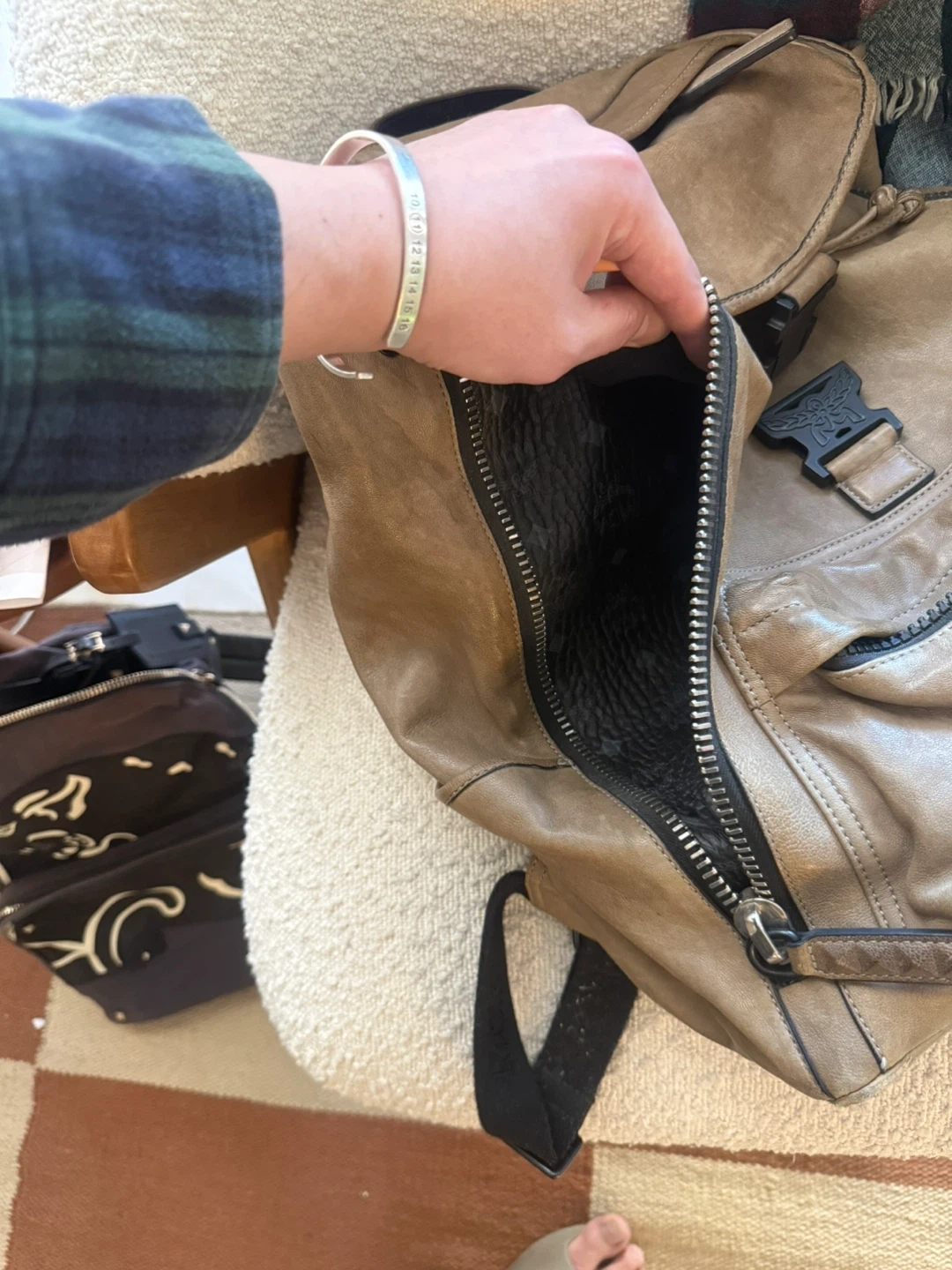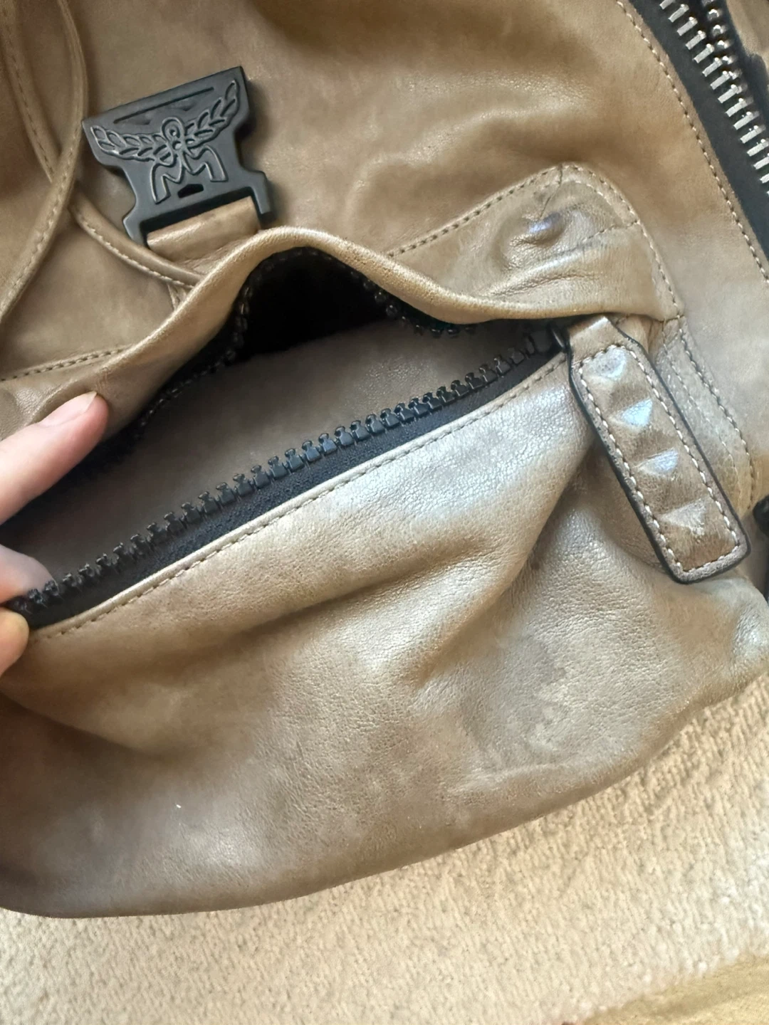Very low key MCM Killian Backpack In Saharh Lambskin, Gray color, for men. Definitely has some personality due to the sign of use of the lambskin, overall still a good condition and very practical use with incredible capacity. Pick up from queens Elmhurst