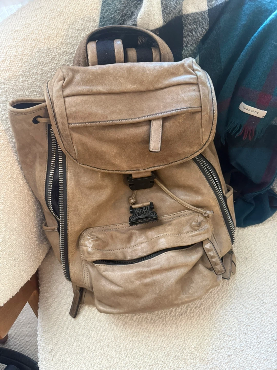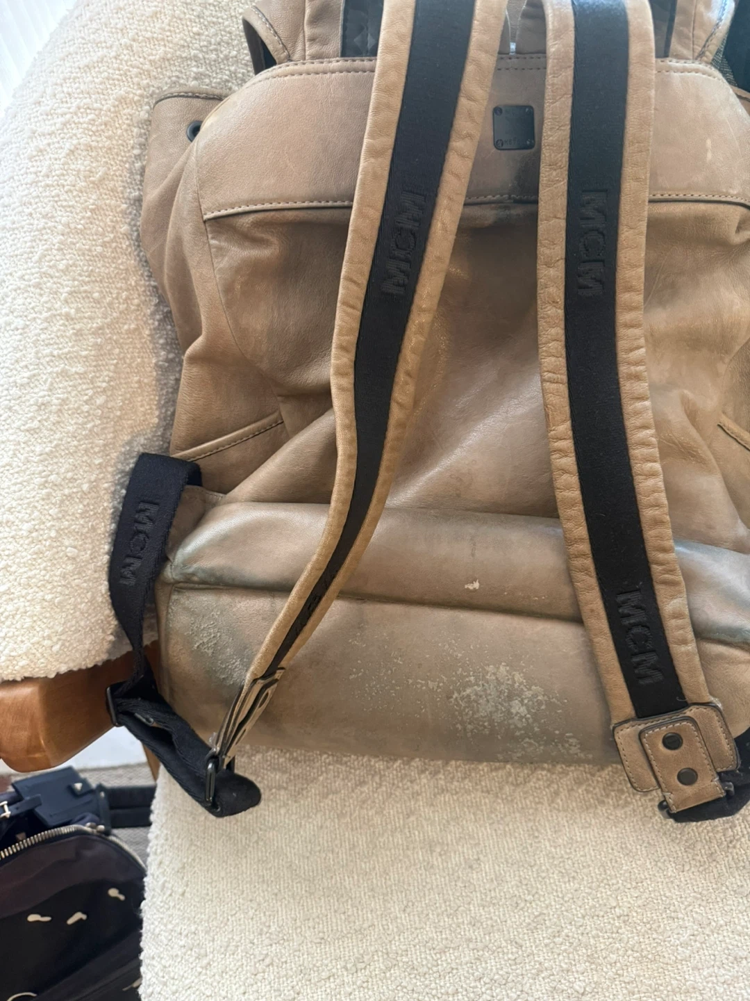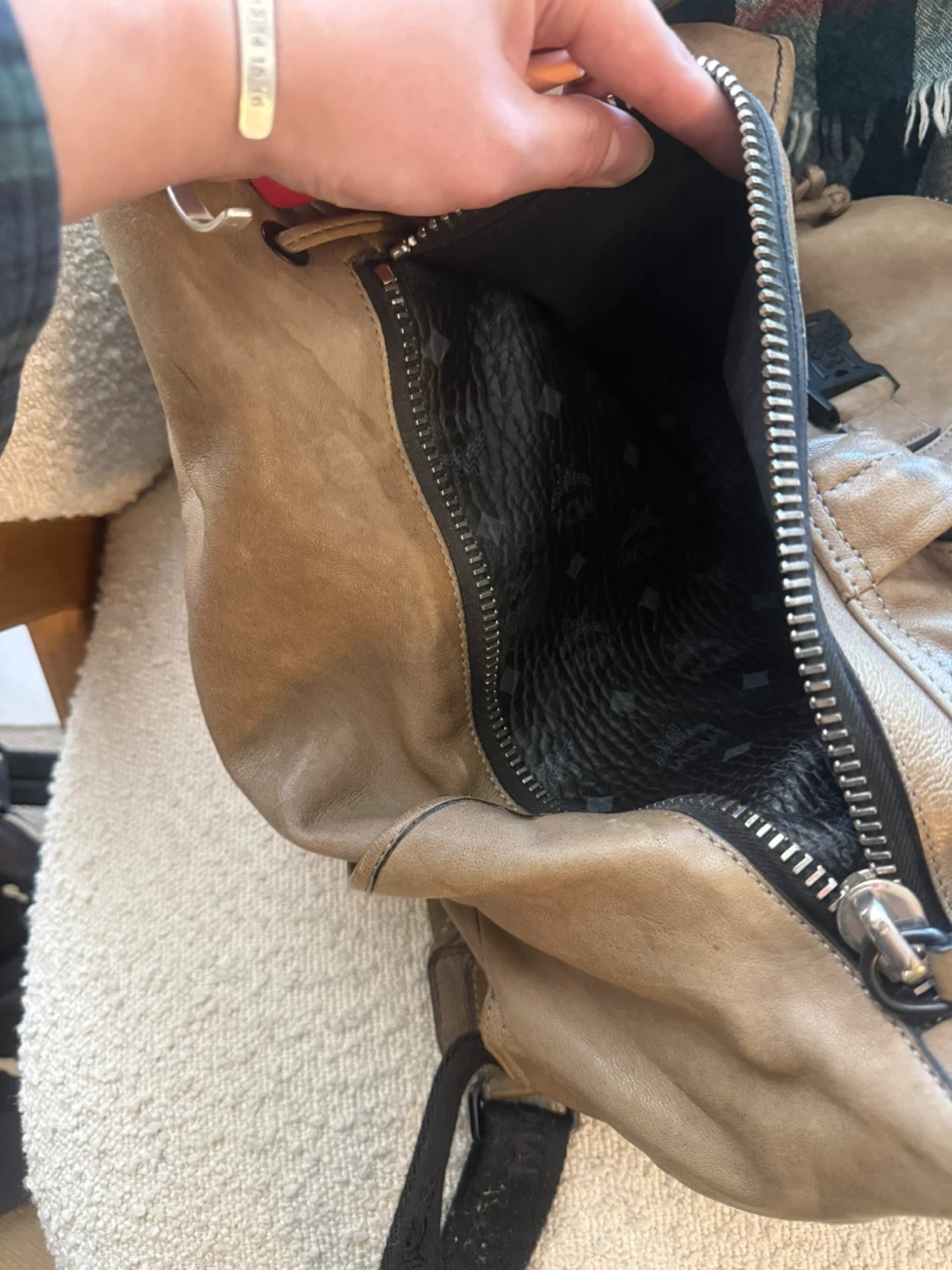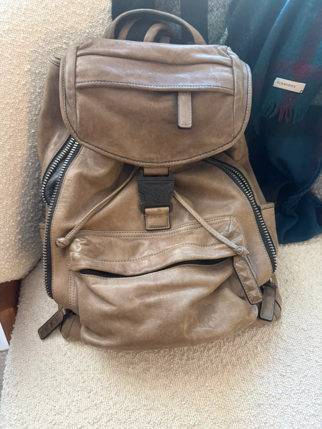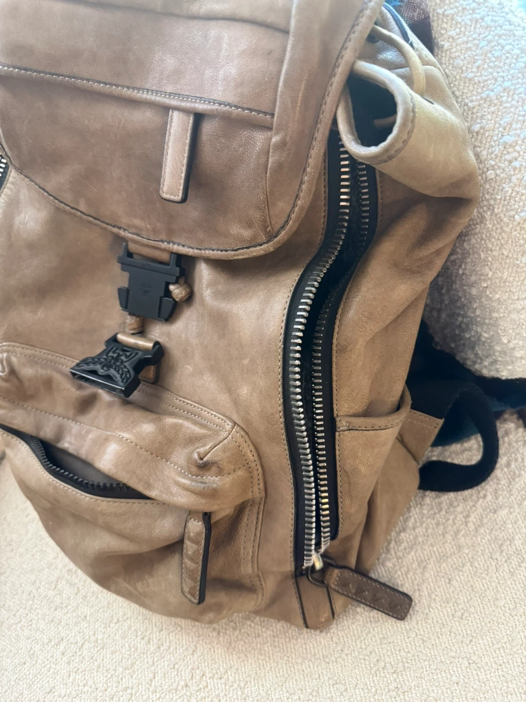 Very low key MCM Killian Backpack In Saharh Lambskin, Gray color, for men. Definitely has some personality due to the sign of use of the lambskin, overall still a good condition and very practical use with incredible capacity. Pick up from queens Elmhurst