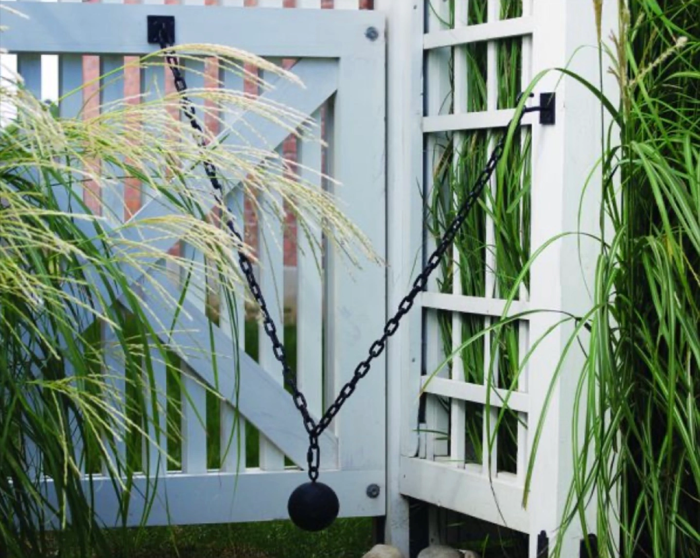 This is a cast iron cannonball gate closer. It is a functional and decorative item, often used in a colonial or farmhouse style, that uses gravity to automatically close a gate.