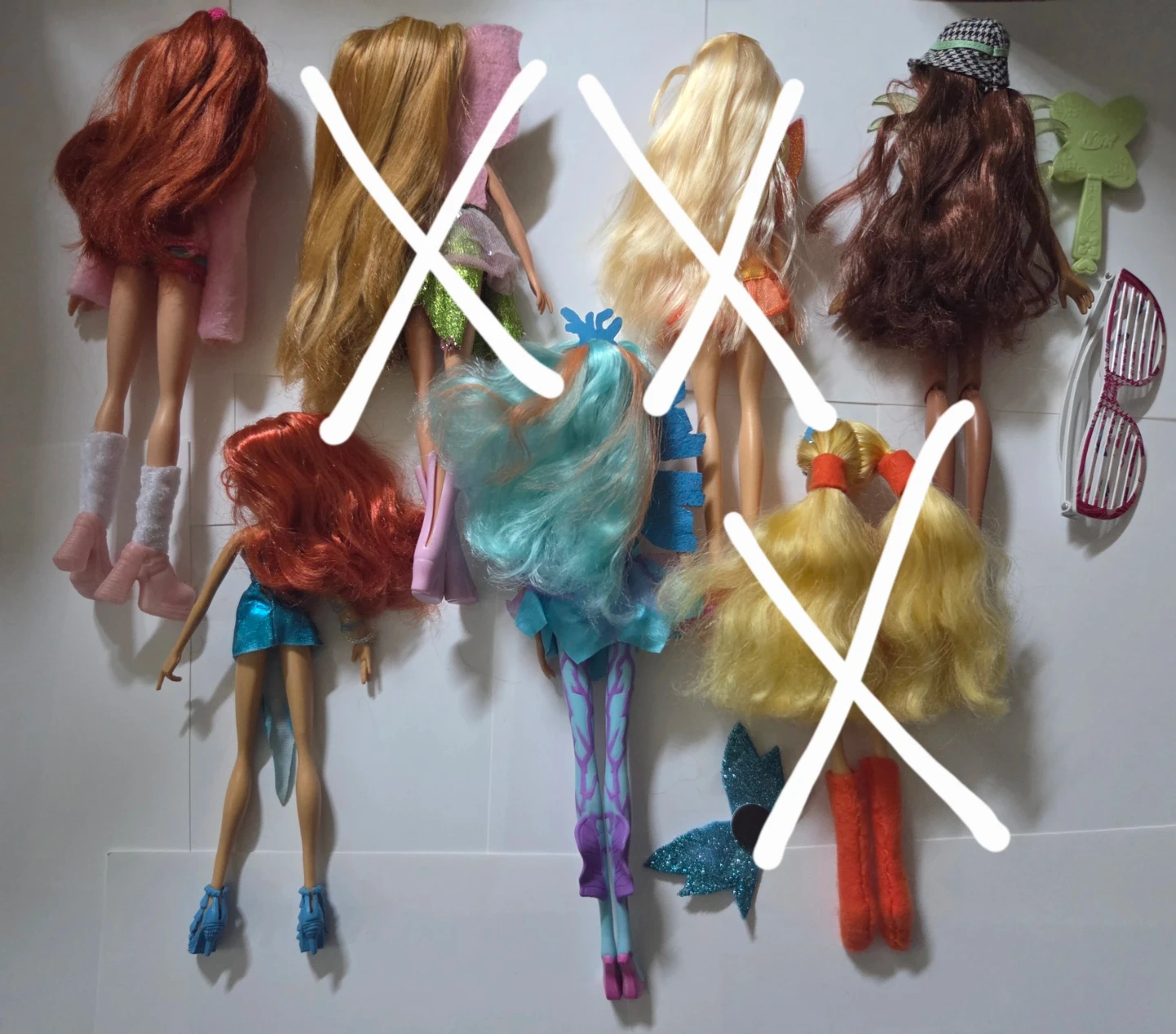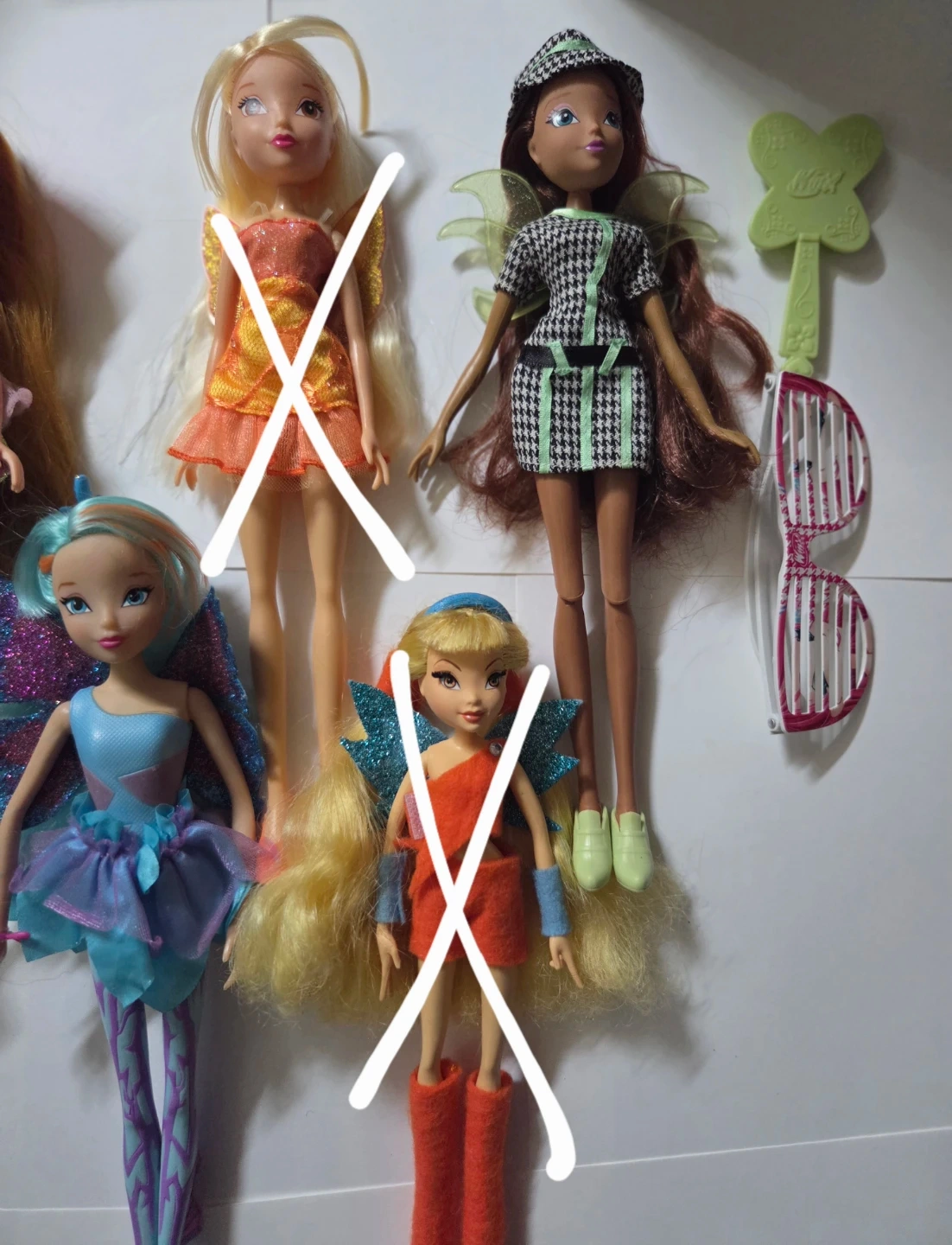 -Mattel Stella ( She's wearing a handmade outfit- top, shorts, boots, hairpieces and wrist pieces made from felt. The headband is 3D printed and painted. Wings are made of felt and has glitter with a magnet. Her hands have defects - see pic) - SOLD