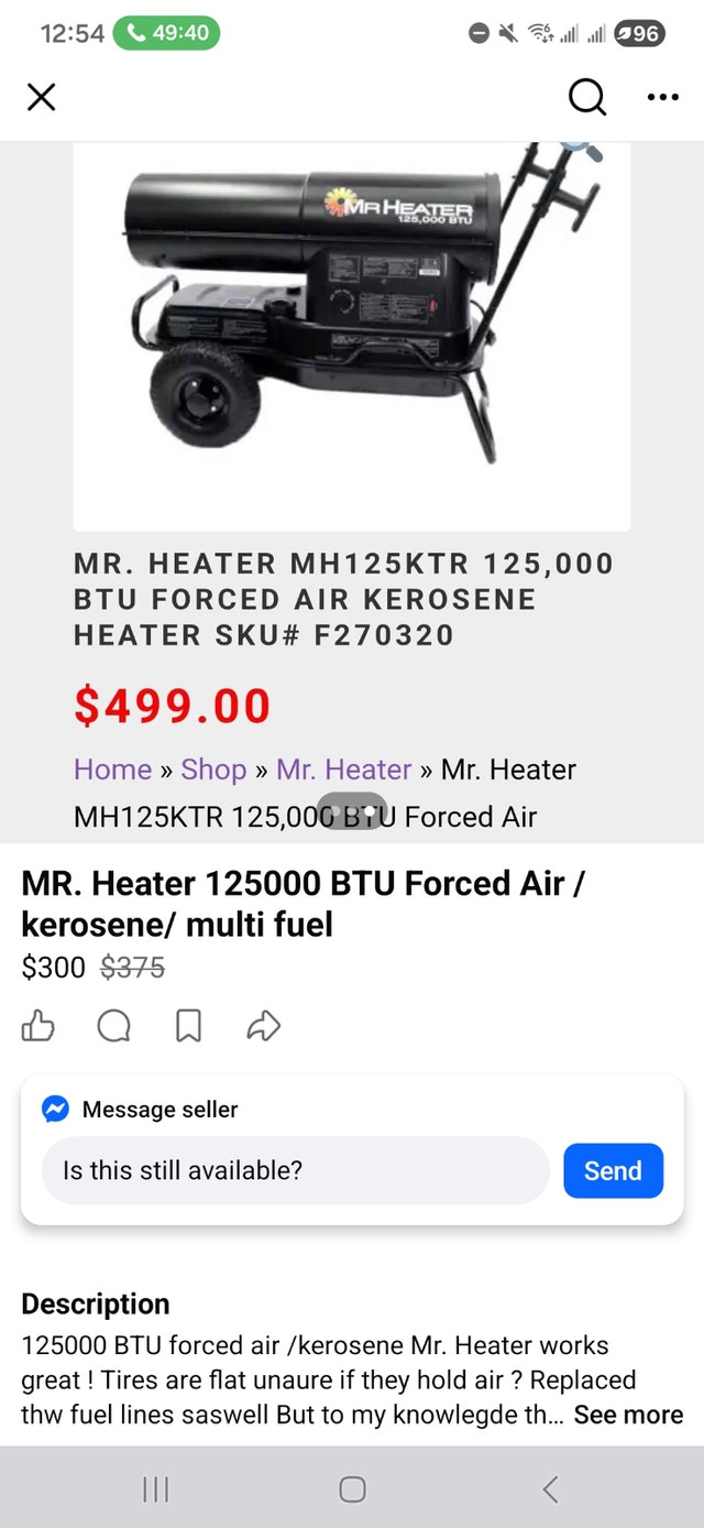 1 / 21 / 2Buy & SellKerosene and Propane Heaters for SaleKerosene and Propane Heaters for Sale$999Selling 2 large kerosene heaters and 2 smaller propane heaters. Used - Like new. For Sale By: Owner.WHERE TO MEETCheck LocationView MapSELLERRyanVermilion Hill100 reviews0 chats·0 favorites·5 viewsSEND CHAT TO SELLERHi Ryan! I’m interested in your listing.Hi Ryan! I’m interested in your listing.Get the Karrot app to chatSign In to chat