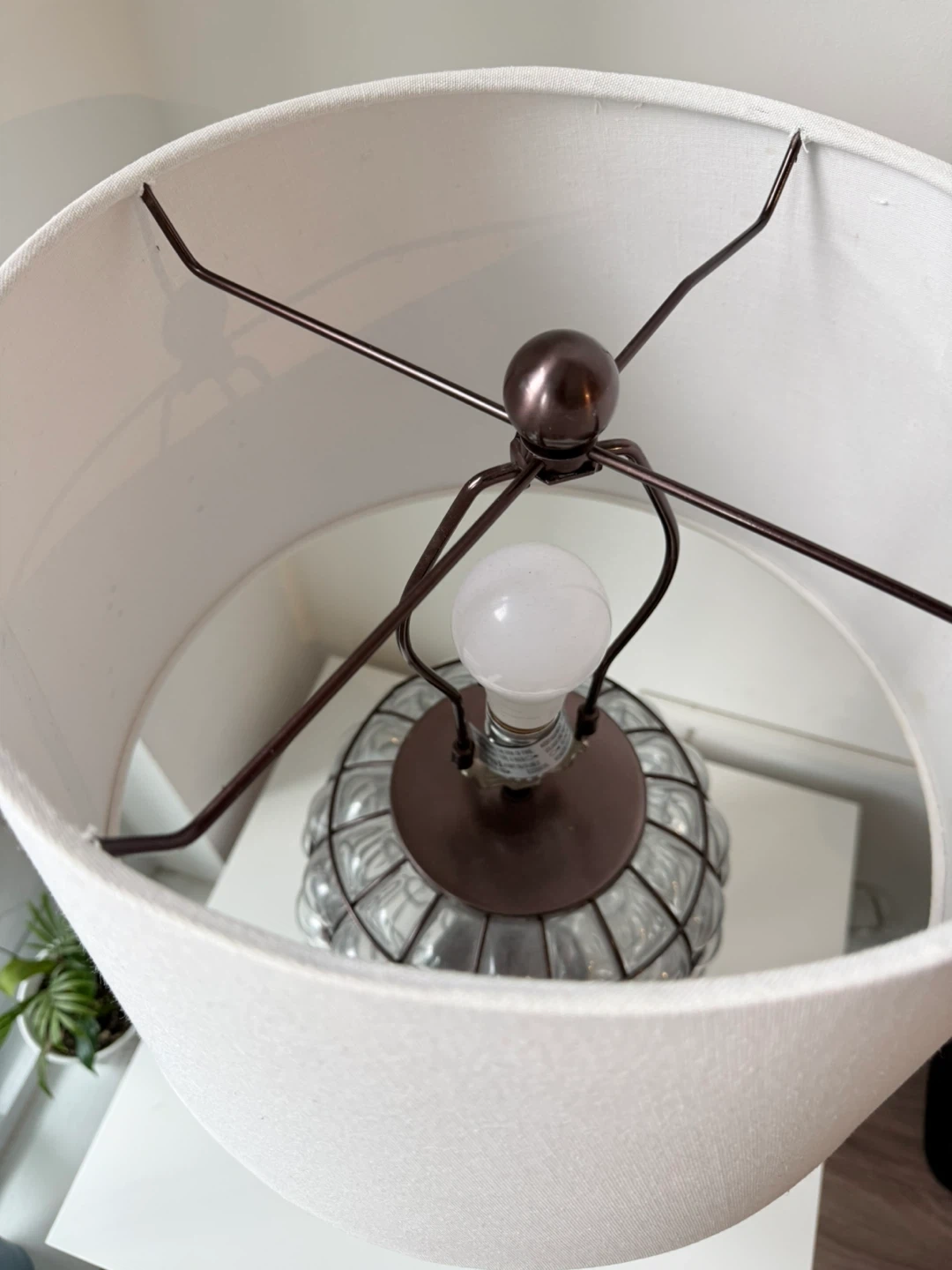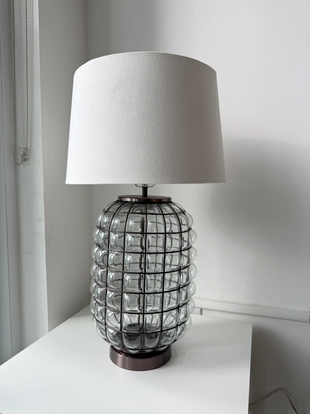 Add a touch of elegance to your space with this beautiful glass table lamp! The unique design and white shade create a warm and inviting atmosphere. Perfect for a bedside table or living room accent