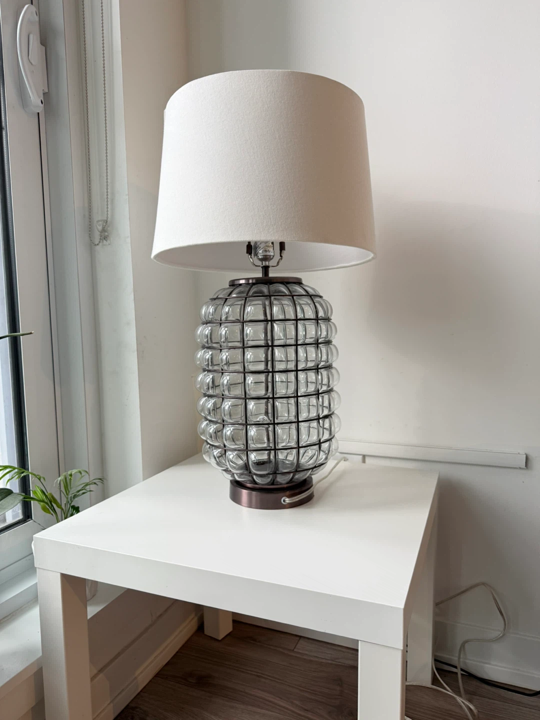 Add a touch of elegance to your space with this beautiful glass table lamp! The unique design and white shade create a warm and inviting atmosphere. Perfect for a bedside table or living room accent