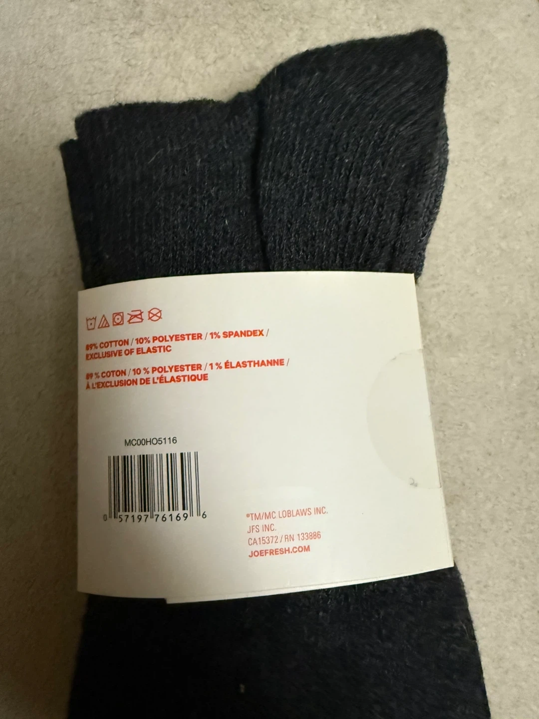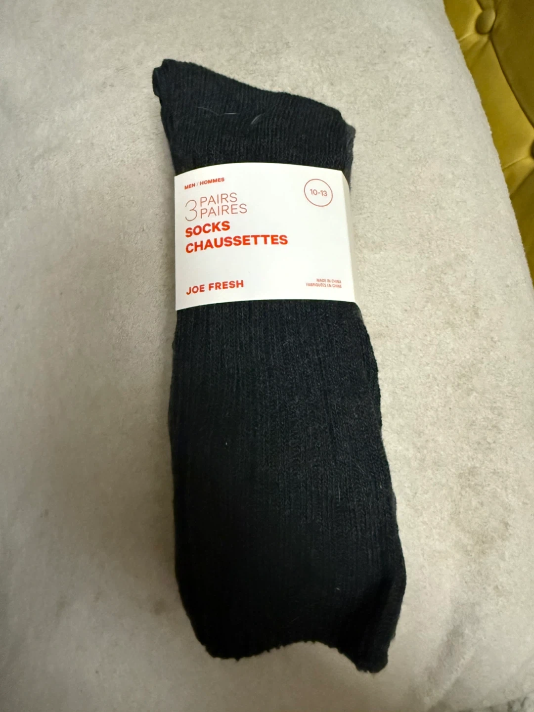 Three pairs of men's socks from Joe Fresh. Size 10-13. Made of 89% cotton, 10% polyester, and 1% spandex. Great for everyday wear!