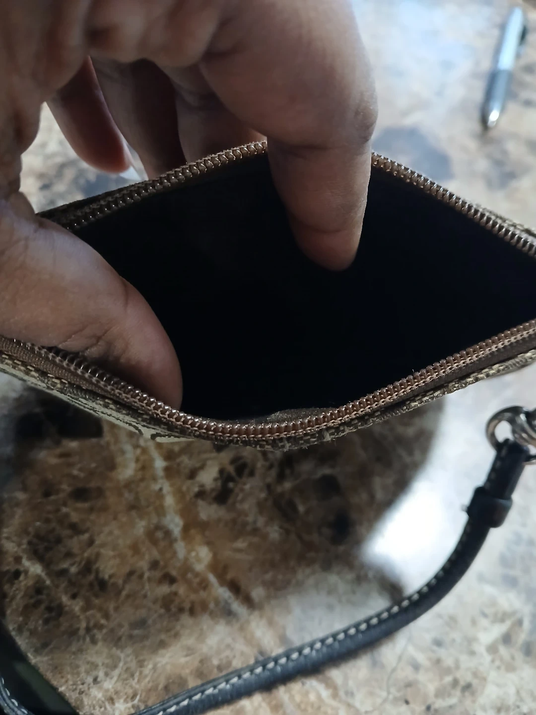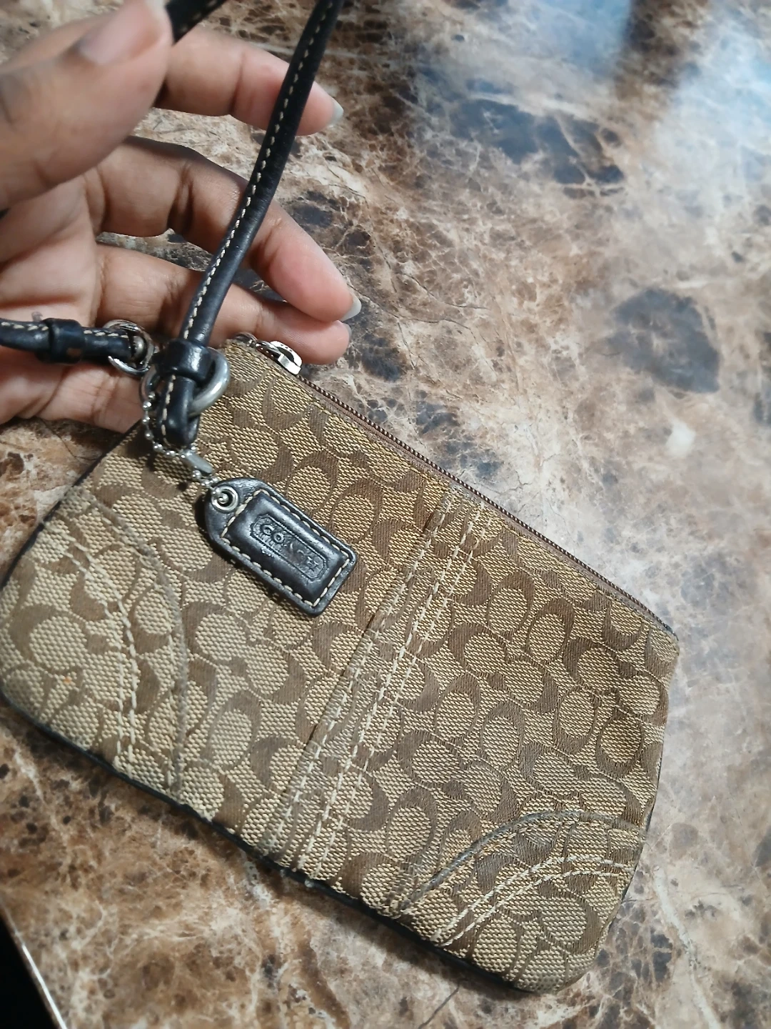 This Coach wristlet pouch features the iconic Signature C canvas pattern. It has a secure zip closure and a removable wrist strap for easy carrying. It's a convenient size for essentials. Price is firm plz. Pick up midland and Danforth or 401 bay street or stc mall
