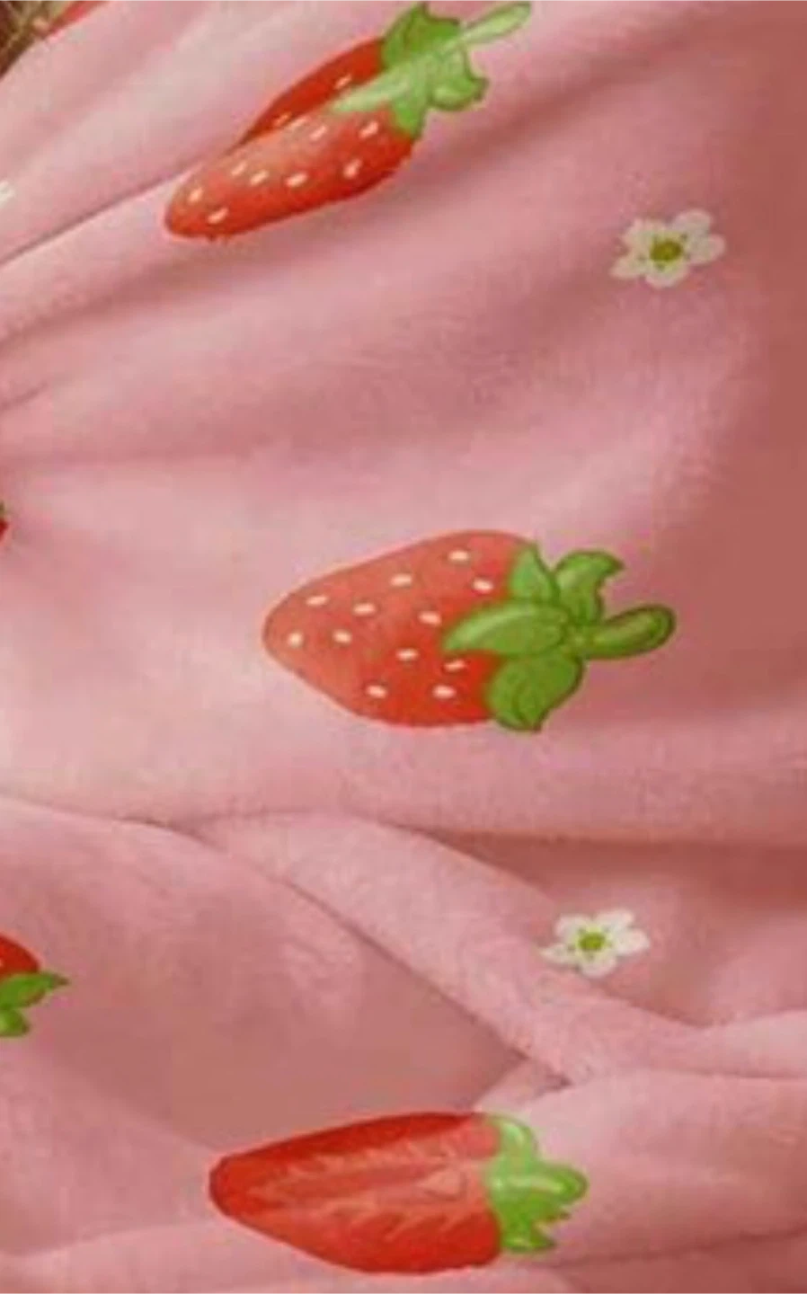 Super soft pink blanket with a cute strawberry pattern. It's made from a plush material.