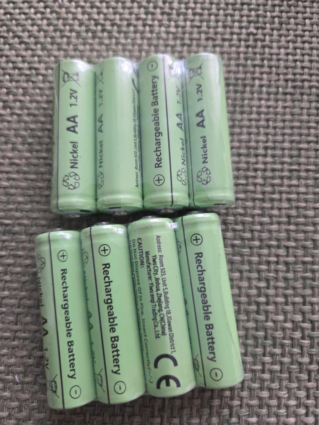 Eight brand new ( packet) rechargeable AA batteries. 1.2V Nickel batteries. Great for solar lights outside and more. Sold as a pack.