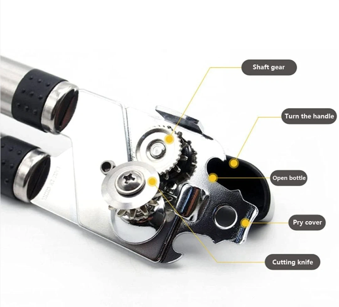This Aoriti can opener has a 3-in-1 handheld design. It's made with stainless steel for durability. This tool also includes a bottle opener function.