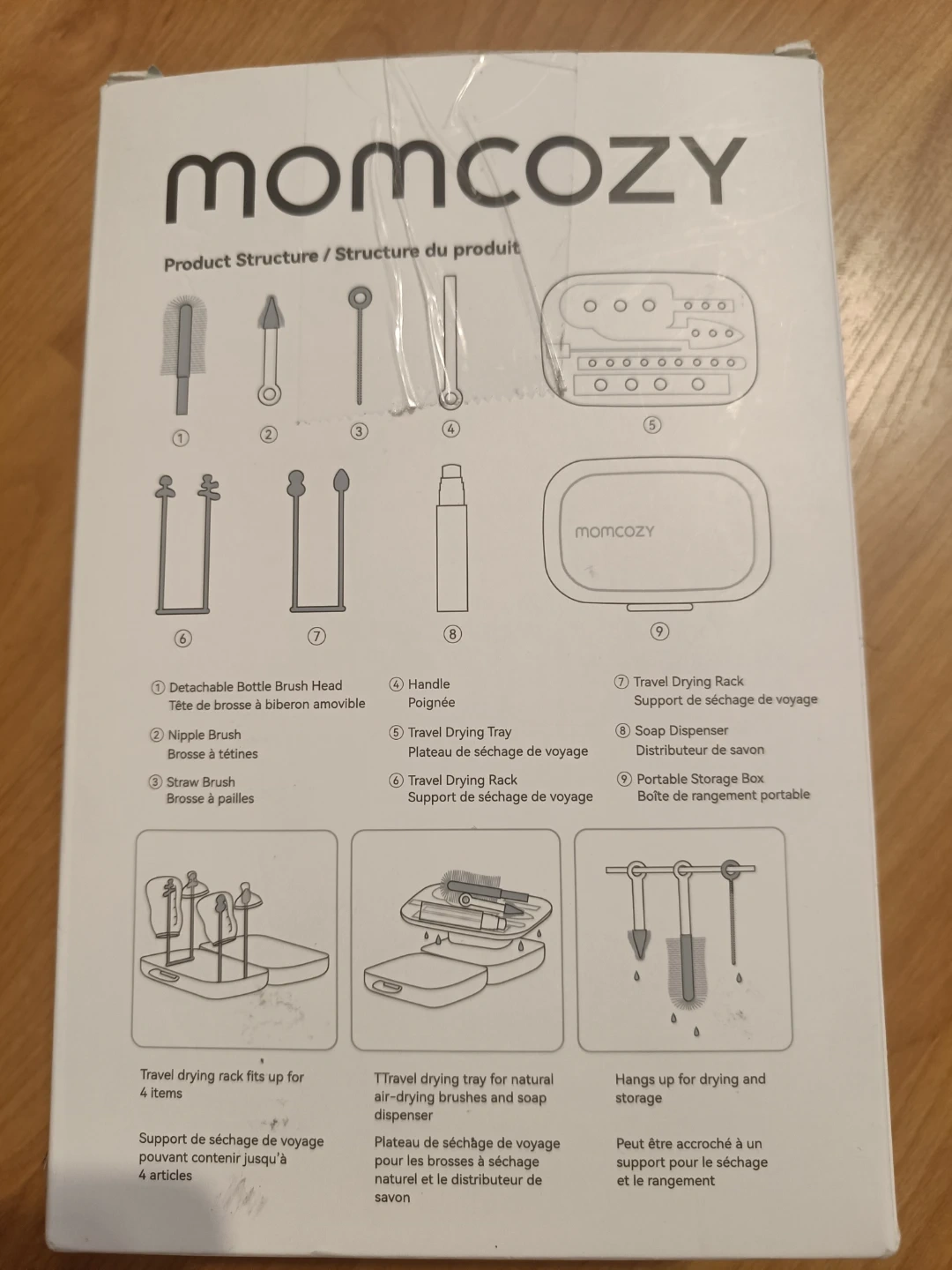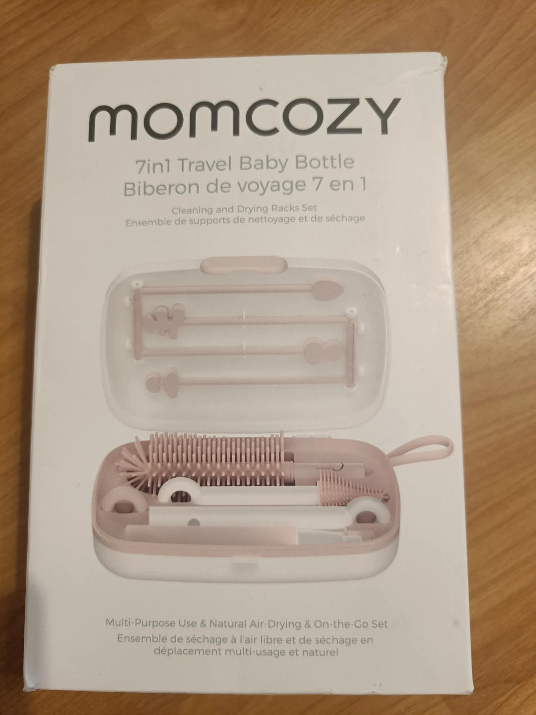 This 7-in-1 travel baby bottle cleaning and drying racks set from MOMCOZY is designed for on-the-go use. It includes a travel drying tray, a portable storage box, a soap dispenser, a detachable bottle brush head, nipple brushes, and straw brushes. This set makes cleaning and drying baby bottles convenient when you're away from home.