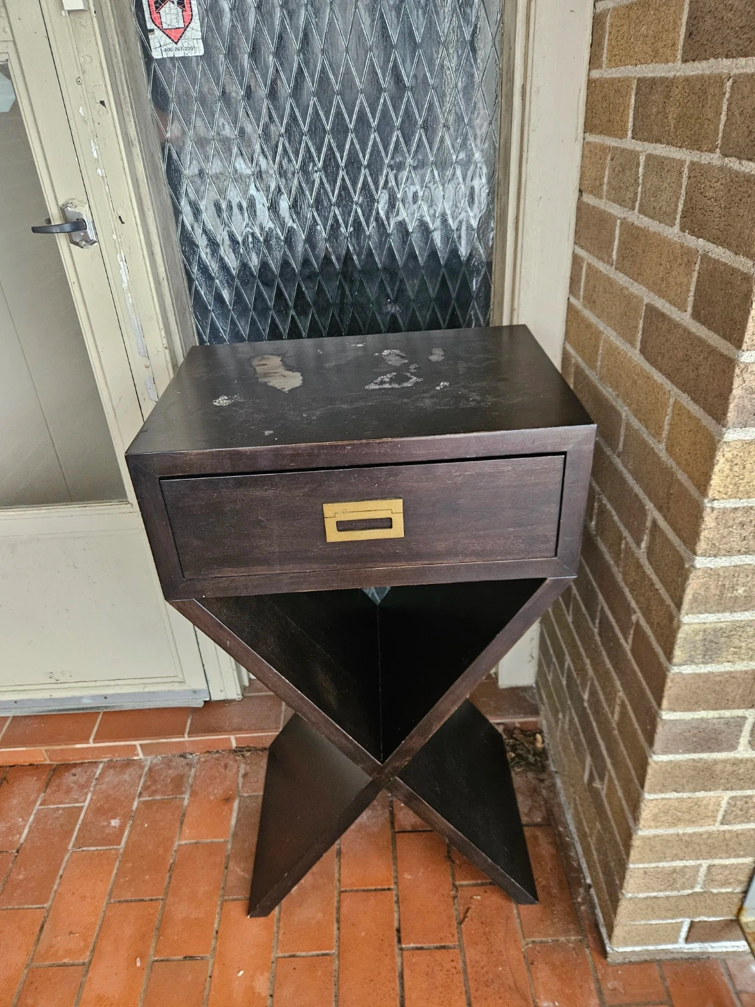 A dark wood accent table with a single drawer. It has a unique criss-cross base design. Great for a bedroom or living room.