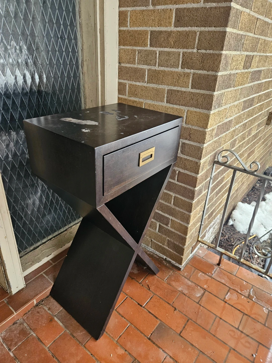 A dark wood accent table with a single drawer. It has a unique criss-cross base design. Great for a bedroom or living room.
