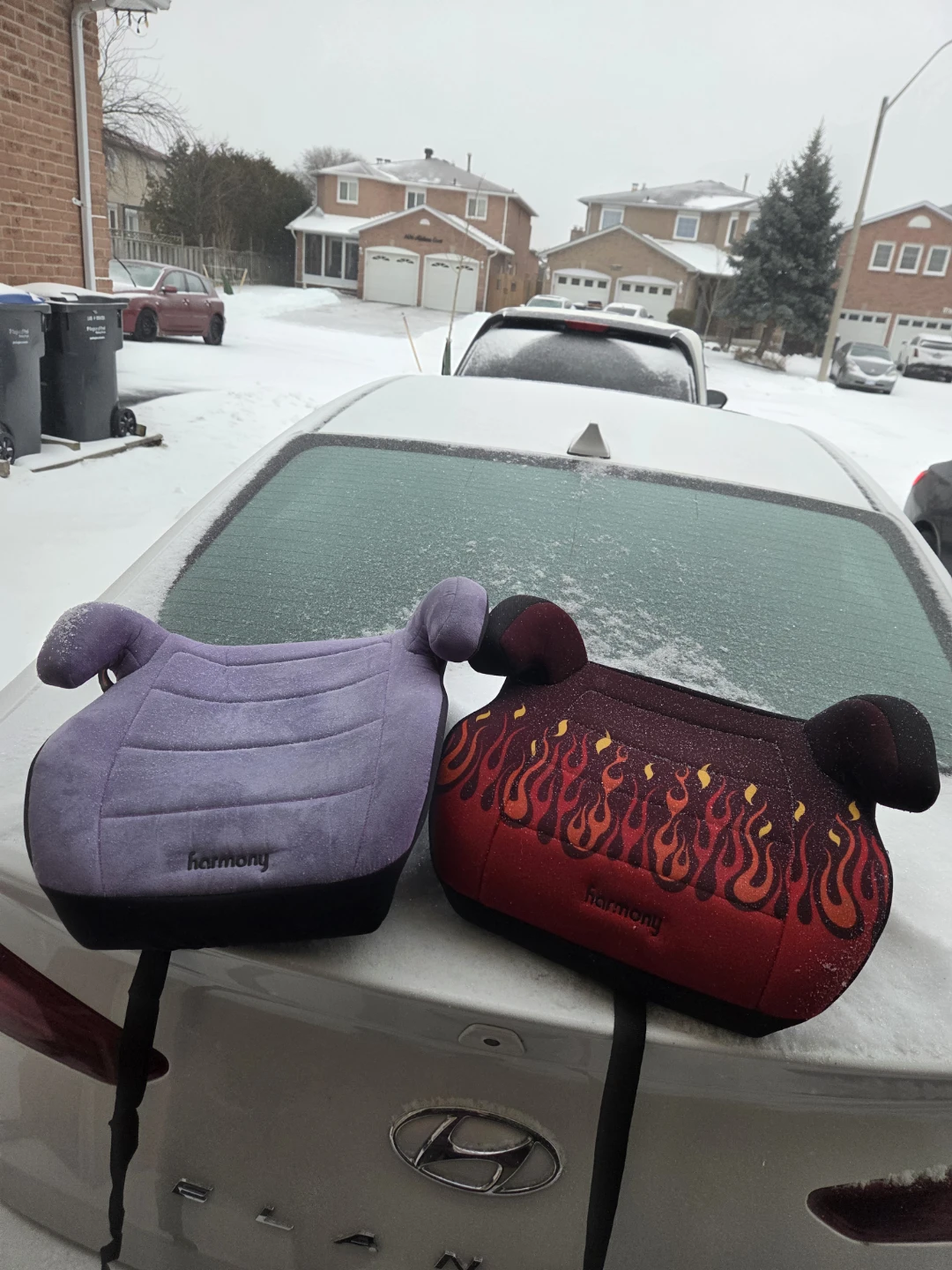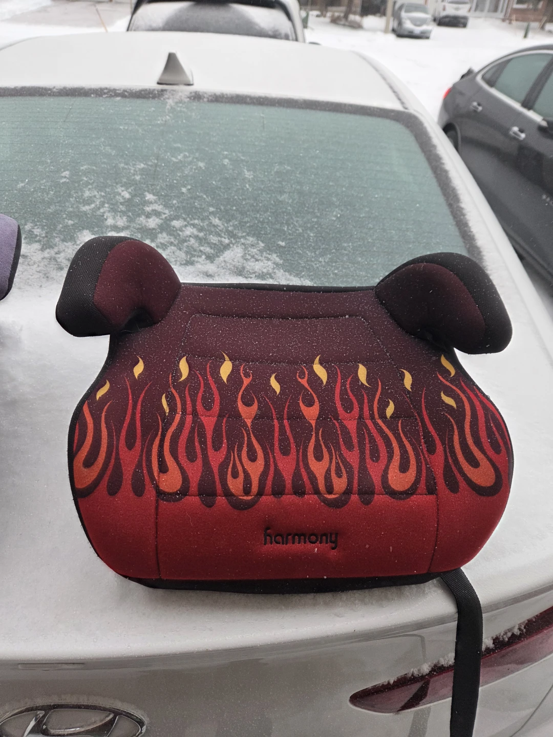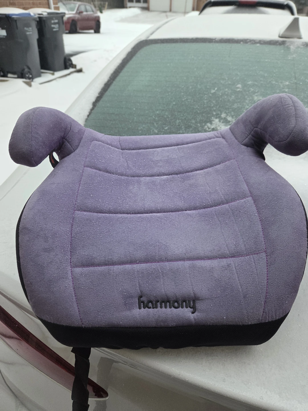 Two Harmony Youth Booster Seats available! One is burgundy with a flame design, and the other is purple. These booster seats are designed for children approximately 4-10 years old who weigh between 18.1-45.4 kg (40-100 lbs) and whose height is 101.6-144.8 cm (40-57 inches). They're in great condition and ready for their next adventure!