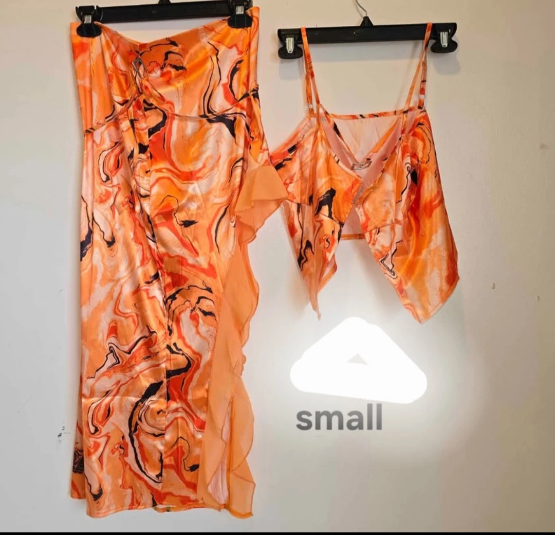Spice up your dance with this vibrant orange marble print two-piece set! The set includes a stylish crop top and a skirt with a unique ruffled hem. Perfect for a night out dancing or a fun date, this set is sure to turn heads. Size small
