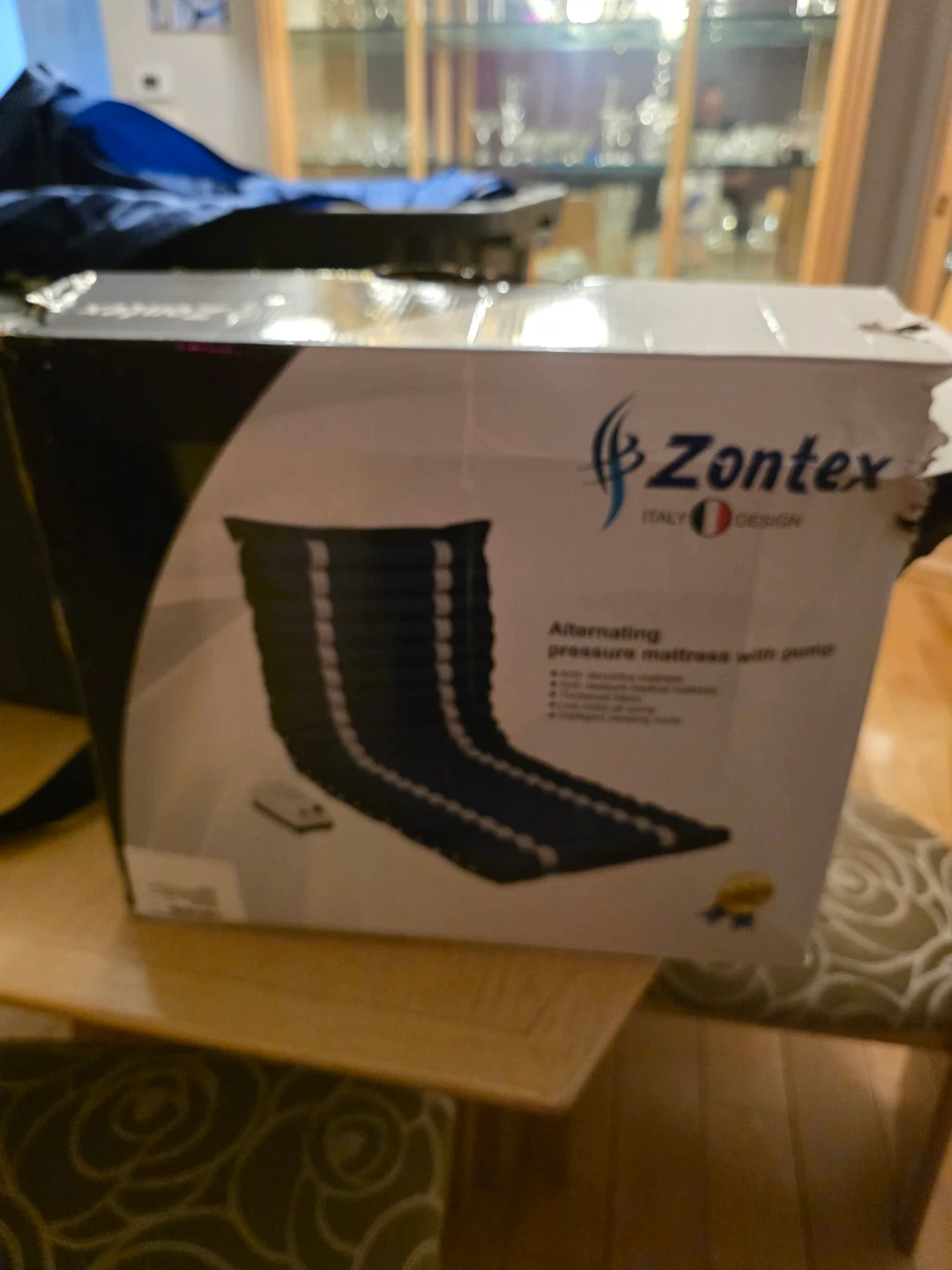 This Zontex alternating pressure mattress comes with an inflator pump. It's designed to provide comfort and support. The pump allows for continuous inflation and deflation cycles. Its to prevent bed soars.