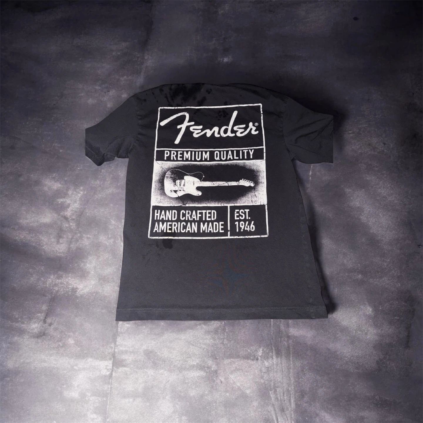 Black Fender t-shirt with "Premium Quality Hand Crafted American Made Est. 1946" graphic. Short sleeves. Cotton material.