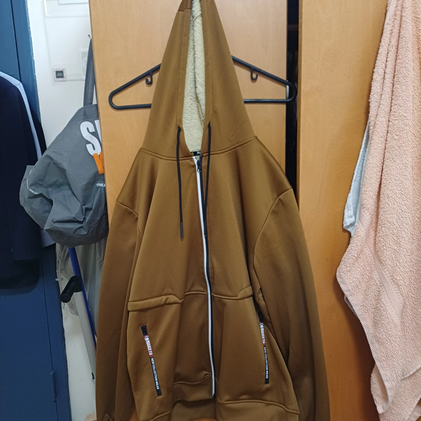 This is a brown zip-up hoodie with a sherpa lining for warmth. It features a full zip closure and two front pockets with decorative zippers. The brand name 'OMGNAGU NEW COLLECTION WEAR' is printed on the pocket accents.
