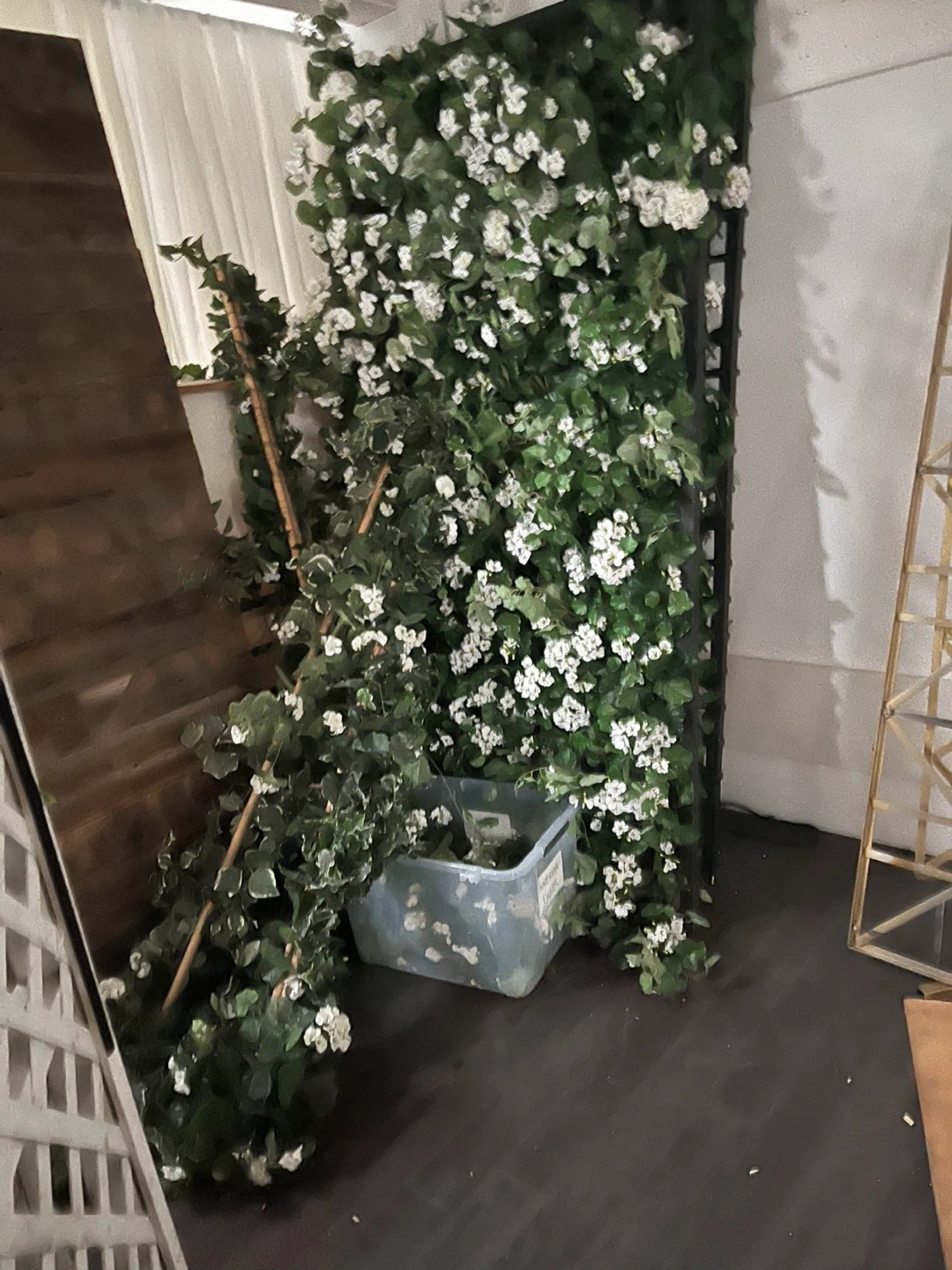 This artificial floral wall is made to create a beautiful backdrop. It's designed with lush greenery and white flowers, perfect for events or home decor. Its modular design makes it easy to set up and customize. This piece brings a touch of nature indoors!