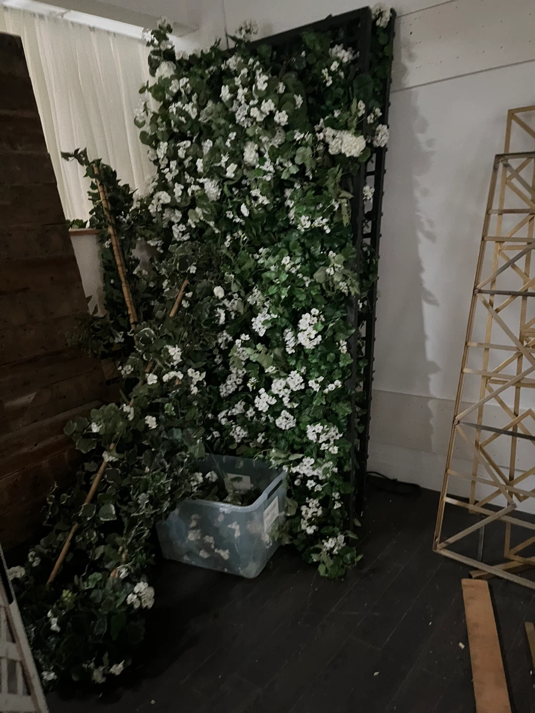 This artificial floral wall is made to create a beautiful backdrop. It's designed with lush greenery and white flowers, perfect for events or home decor. Its modular design makes it easy to set up and customize. This piece brings a touch of nature indoors!
