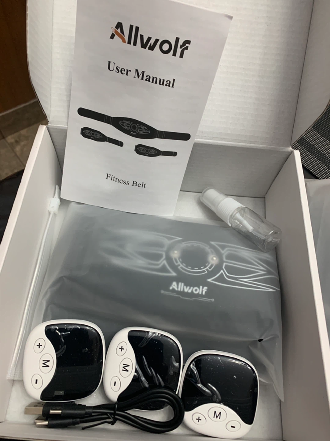 This Allwolf fitness belt set includes one main abdominal belt and two smaller arm/leg stimulators. It comes with a user manual and a small spray bottle for gel application. The set is designed for muscle stimulation.