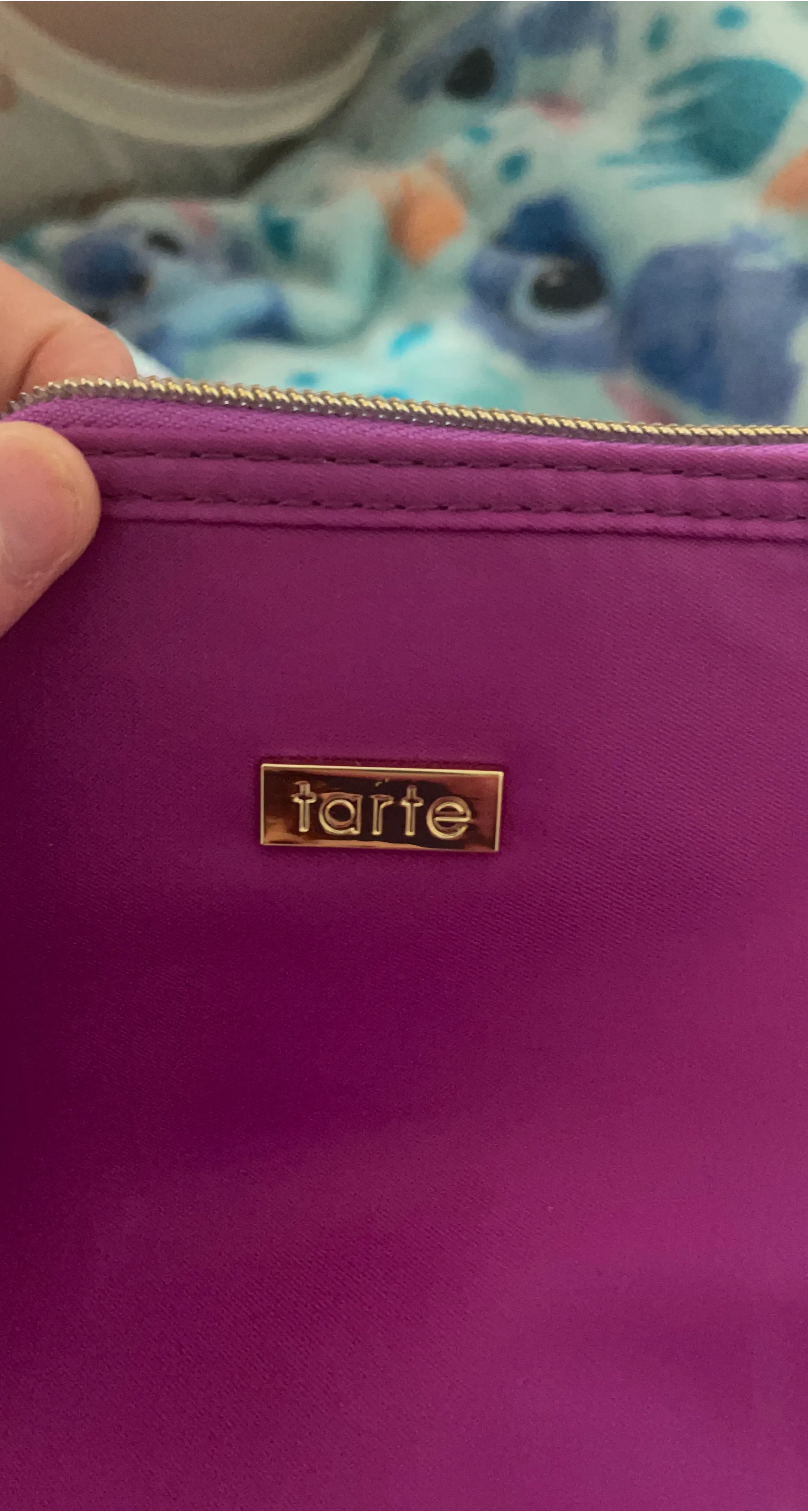 This is a Tarte makeup pouch. It's a vibrant purple colour with a gold zipper. It's perfect for storing makeup or other small essentials.