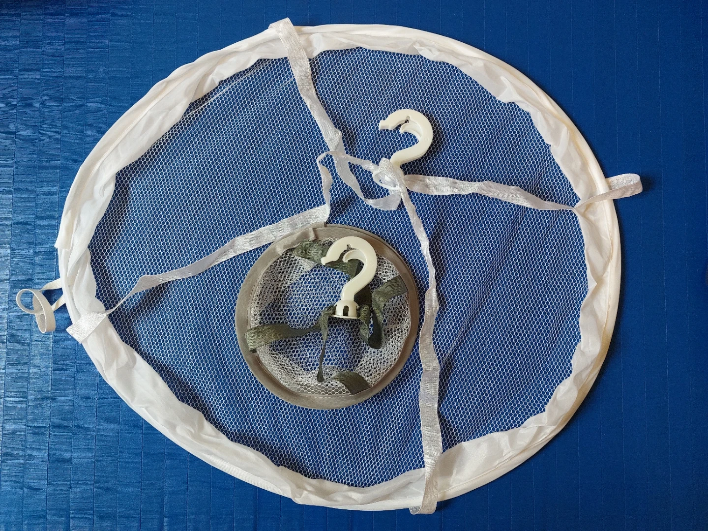 These are two hanging mesh drying hampers. One is very small, the other is collapsible. It's made of white mesh fabric with a hook for hanging. They collapse flat for easy storage. It's useful for drying delicates or small laundry items.