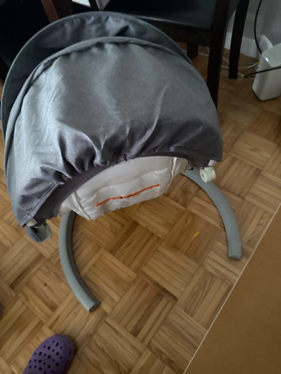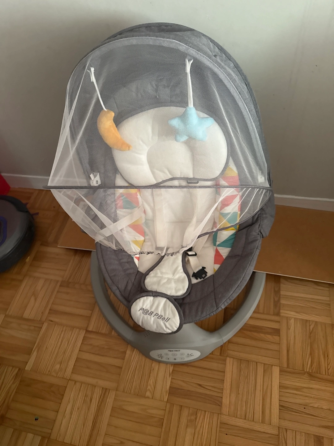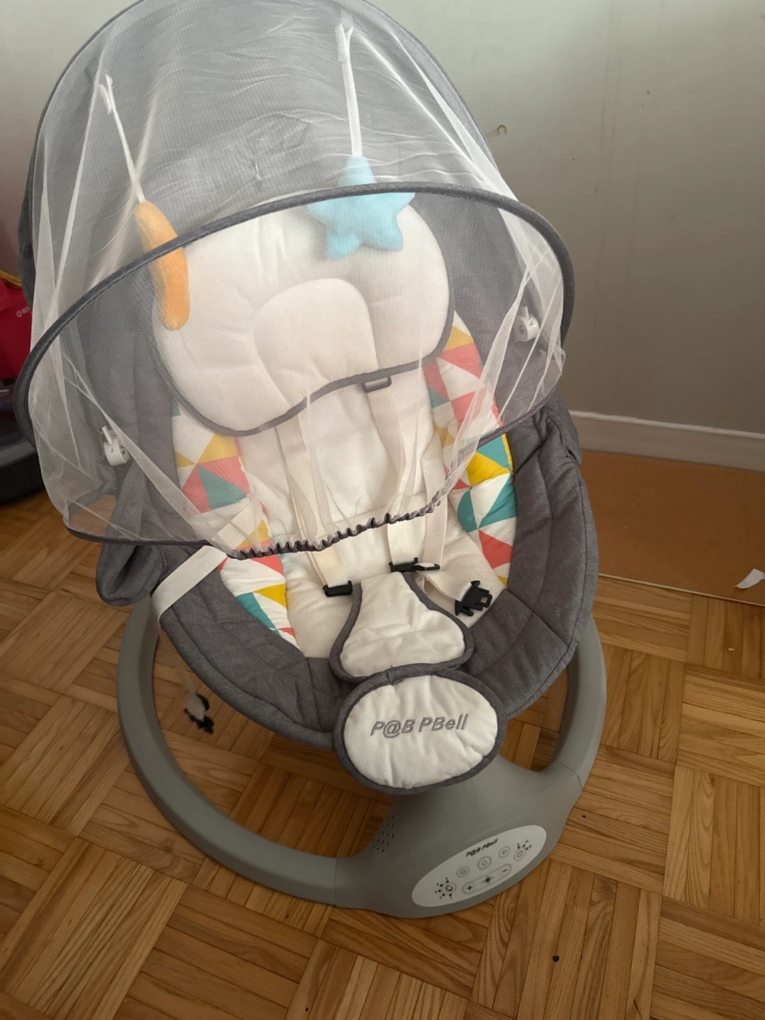 Grey and colourful baby bouncer. Features a removable canopy, vibration, and music. Gently used, in good condition. Brought this for my daughter and put her in it a few times but she didn’t like it so it’s just sitting here so I’ll like to just get it of as it’s only taking up space because I do not use it .
