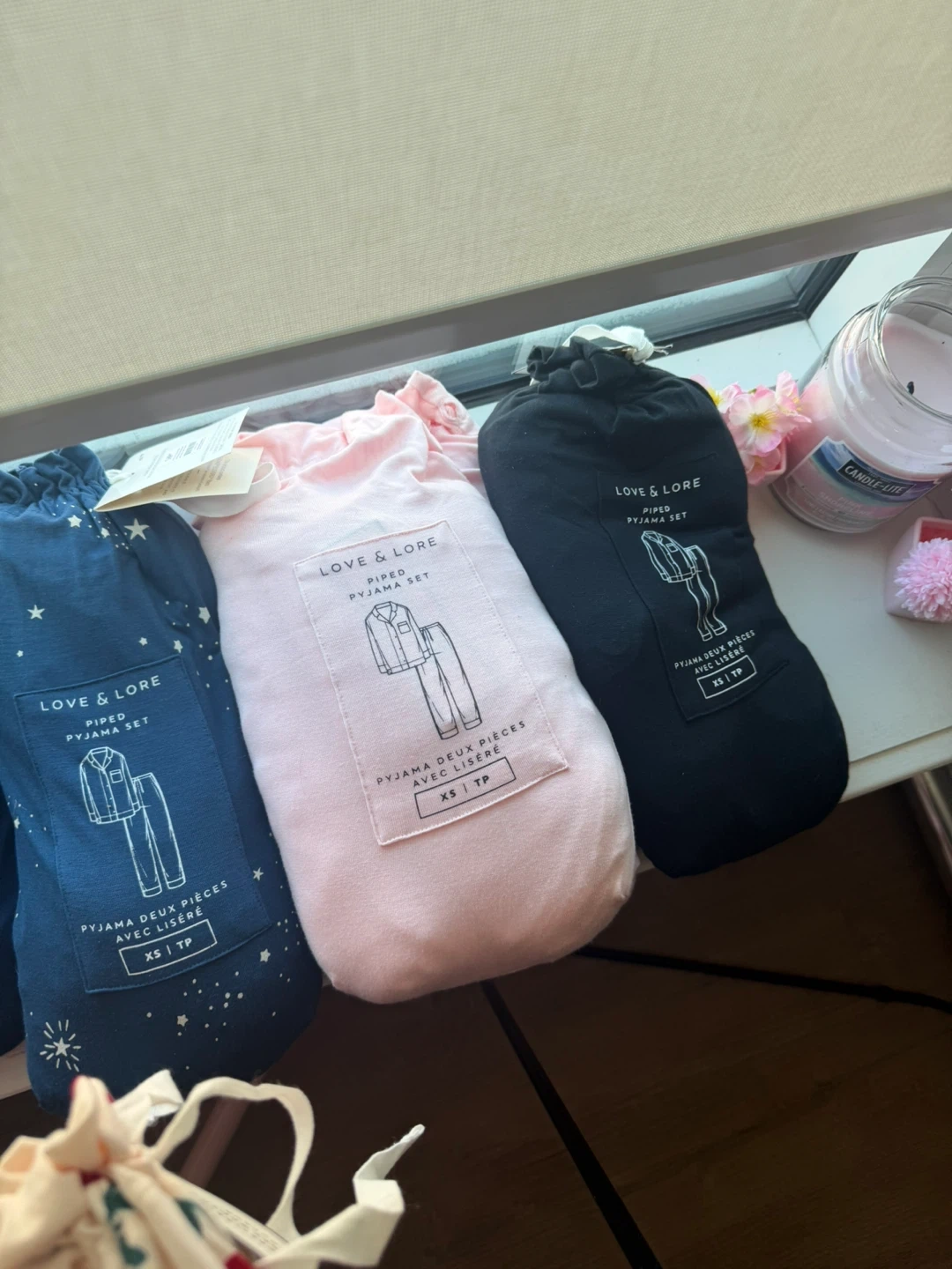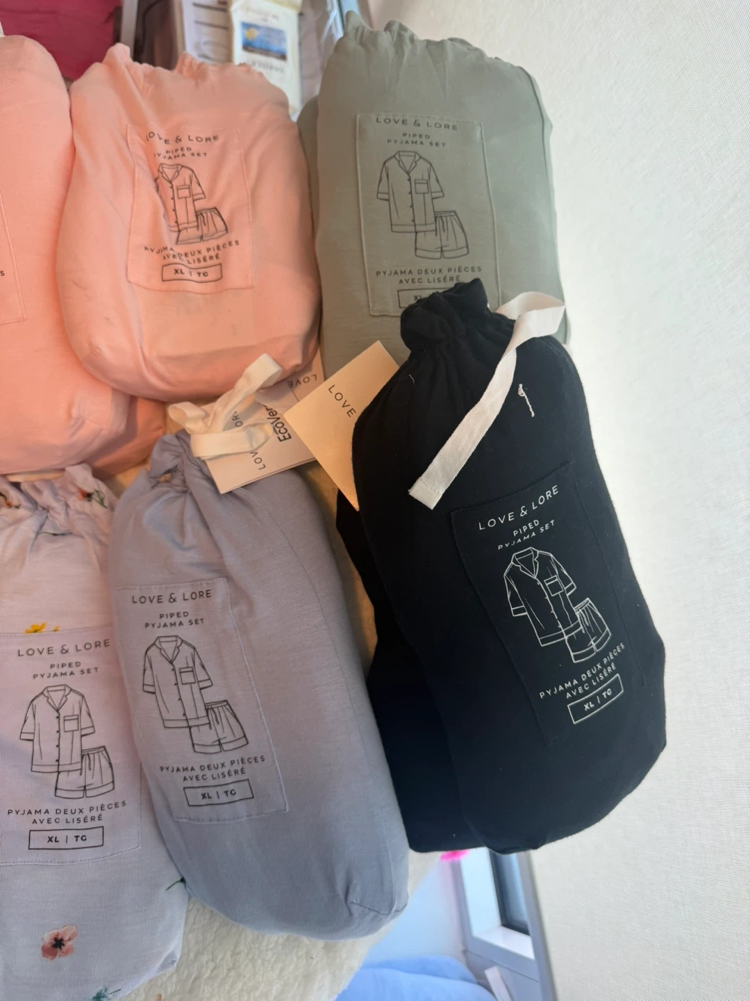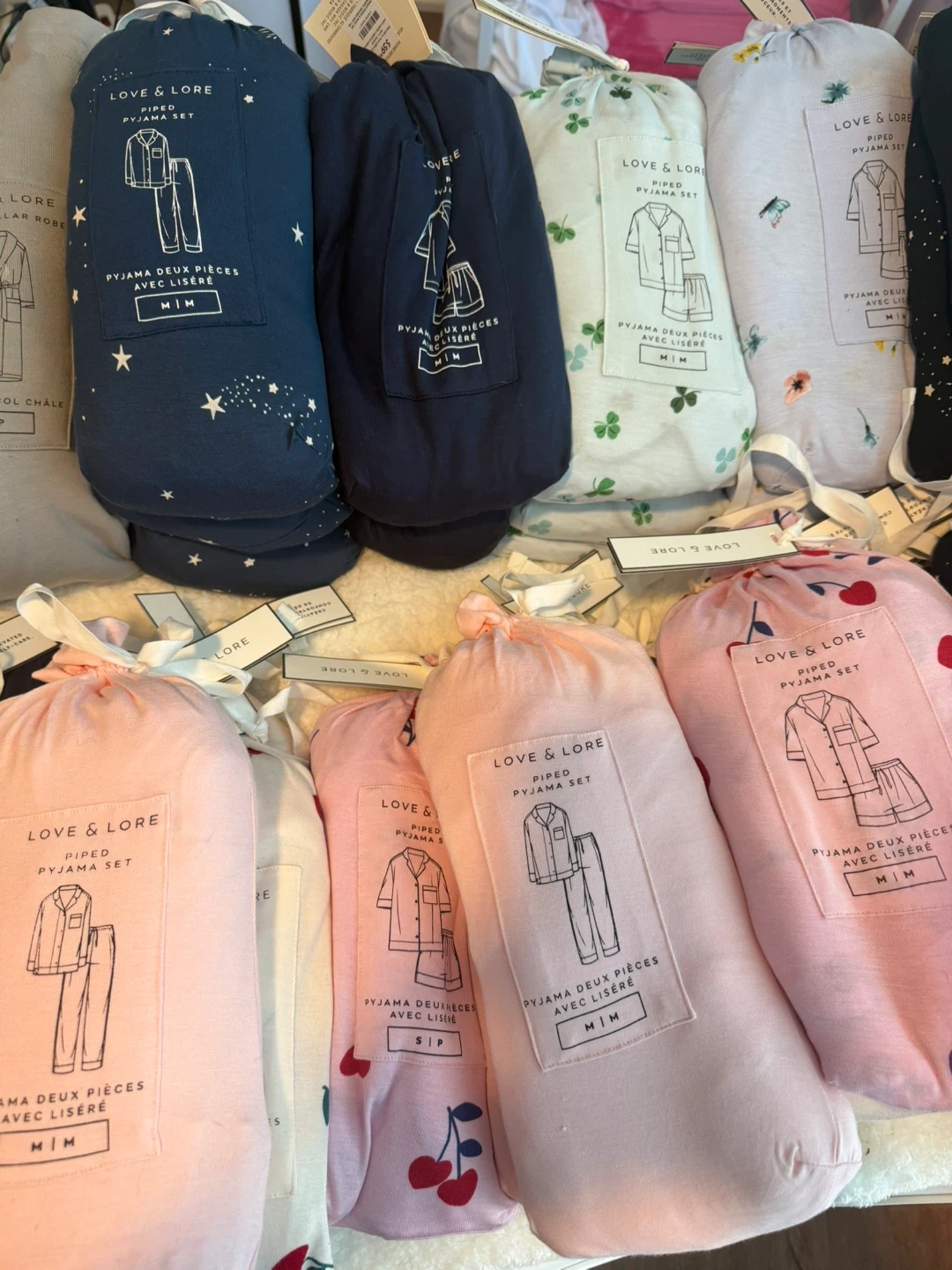 This Love & Lore pyjama set features a classic piped design. It includes a button-up top and matching bottoms, perfect for lounging. Available in various prints and sizes.