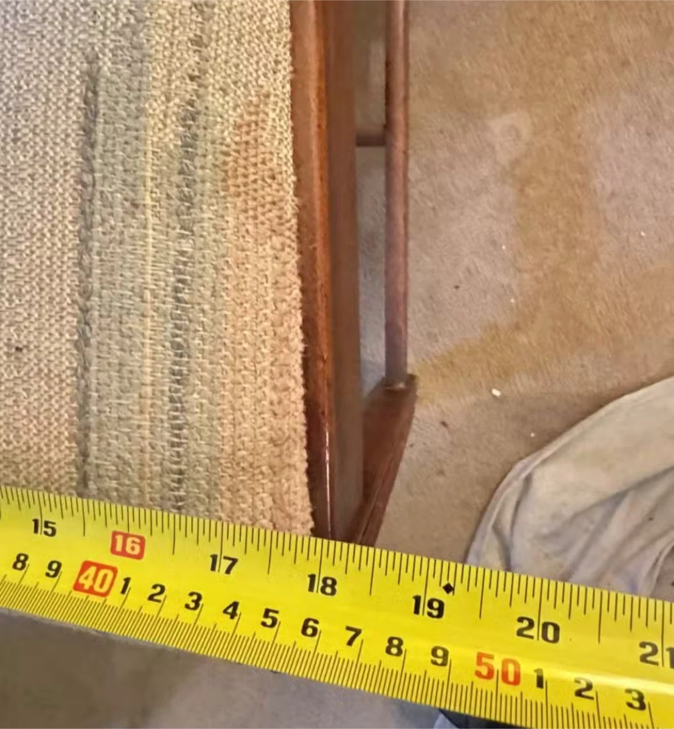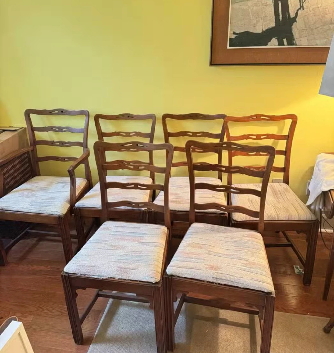 Six wooden dining chairs with upholstered seats and curved backs. The seats have a neutral fabric with subtle multi-coloured stripes. One chair includes arms and has a rattan insert. Seat height approx 18 inches.