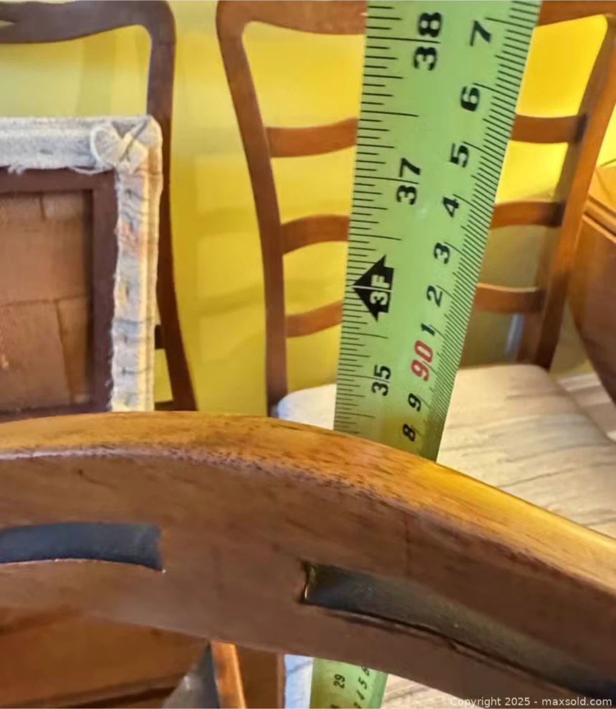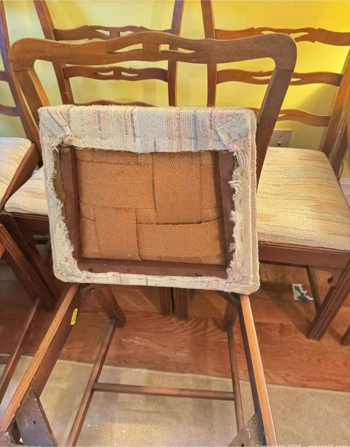 Six wooden dining chairs with upholstered seats and curved backs. The seats have a neutral fabric with subtle multi-coloured stripes. One chair includes arms and has a rattan insert. Seat height approx 18 inches.