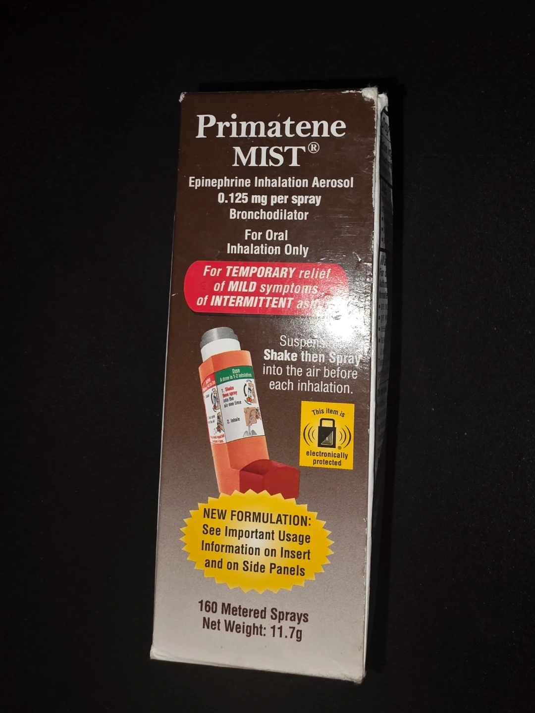 Selling a Primatene Mist Epinephrine Inhalation Aerosol. It contains 0.125 mg per spray and acts as a bronchodilator. Please see the included insert and side panels for important usage information. The box includes directions and drug facts for safe and effective use