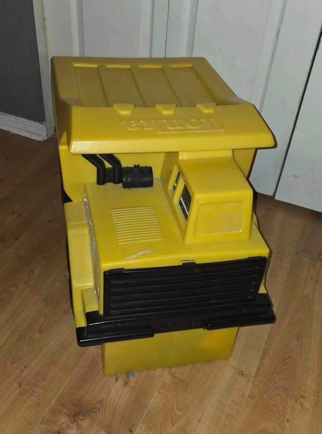 This is a Tonka dump truck toy. It's yellow and functions as a storage box. The lid is removable, and it has a large compartment inside. This would be great for organizing toys!