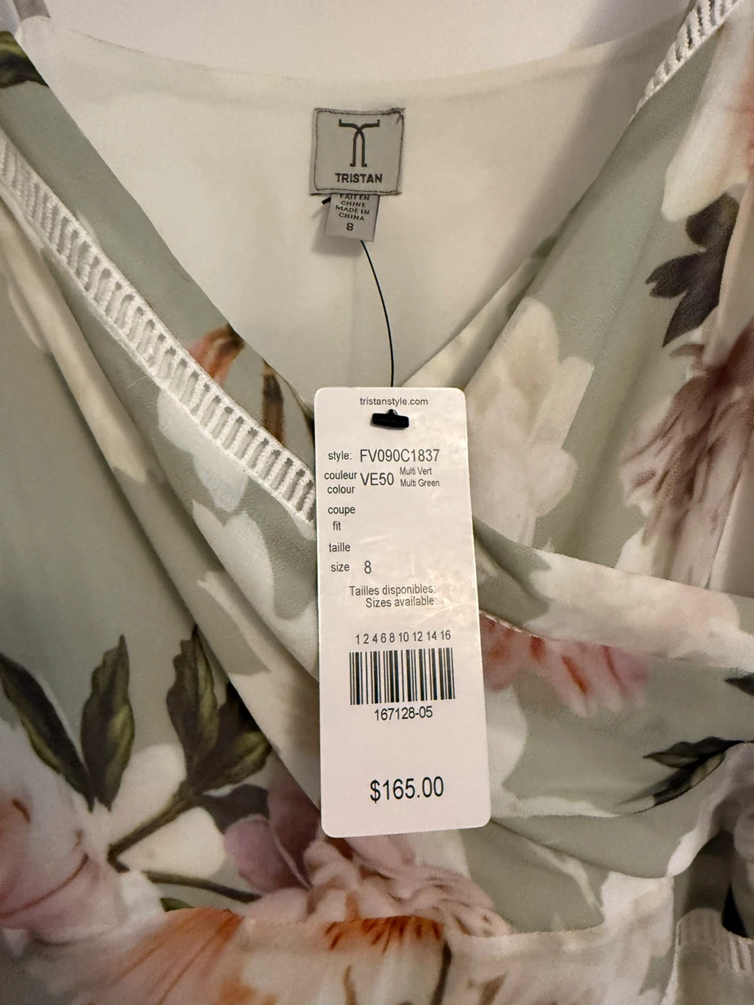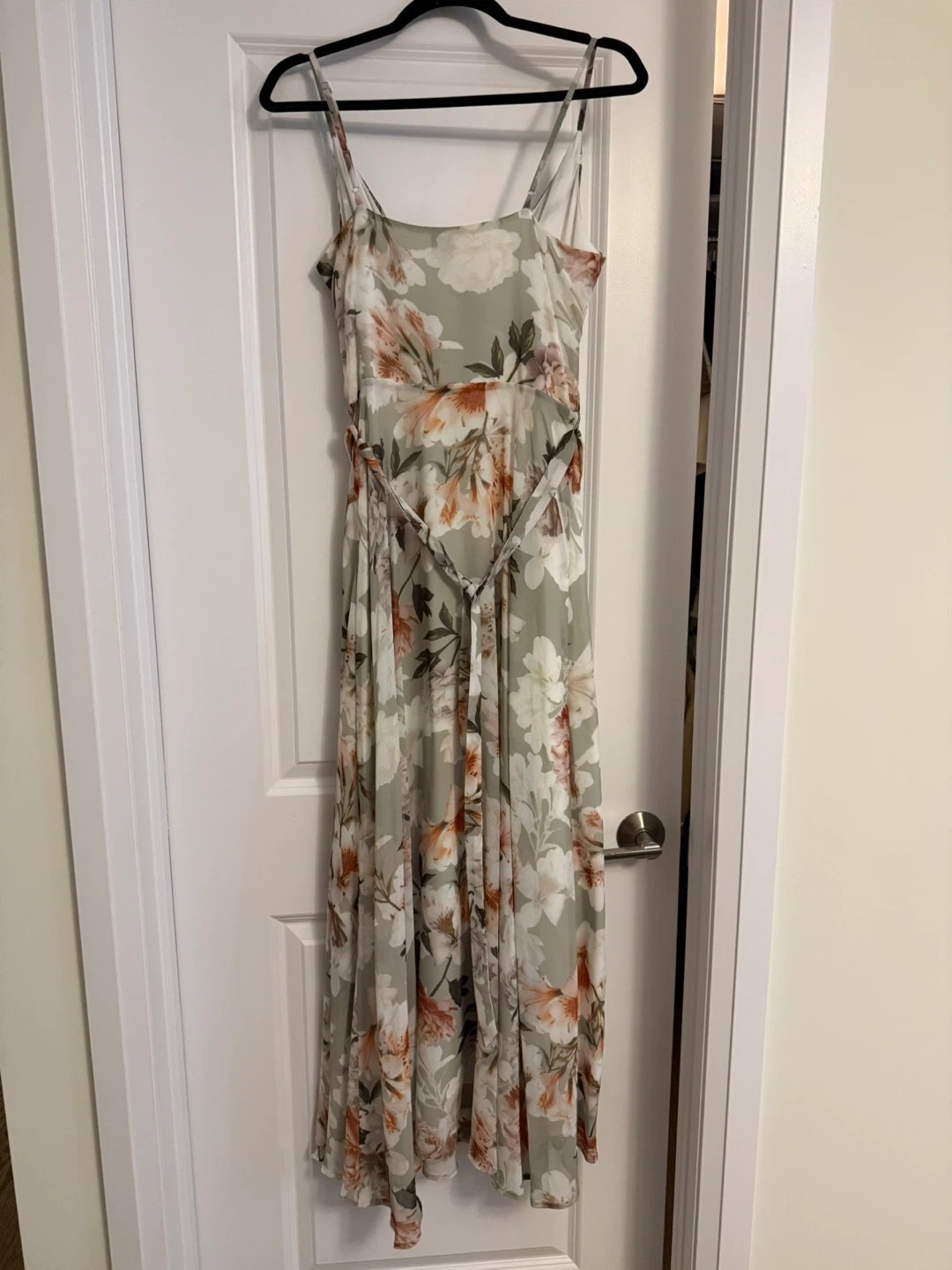 This Tristan maxi dress features a beautiful floral print with a sage green base and coral and white accents. It has a flattering V-neckline, adjustable spaghetti straps, and a tie waist. The fabric is lightweight and flowing, with a lace trim detail along the skirt. Size is 8.