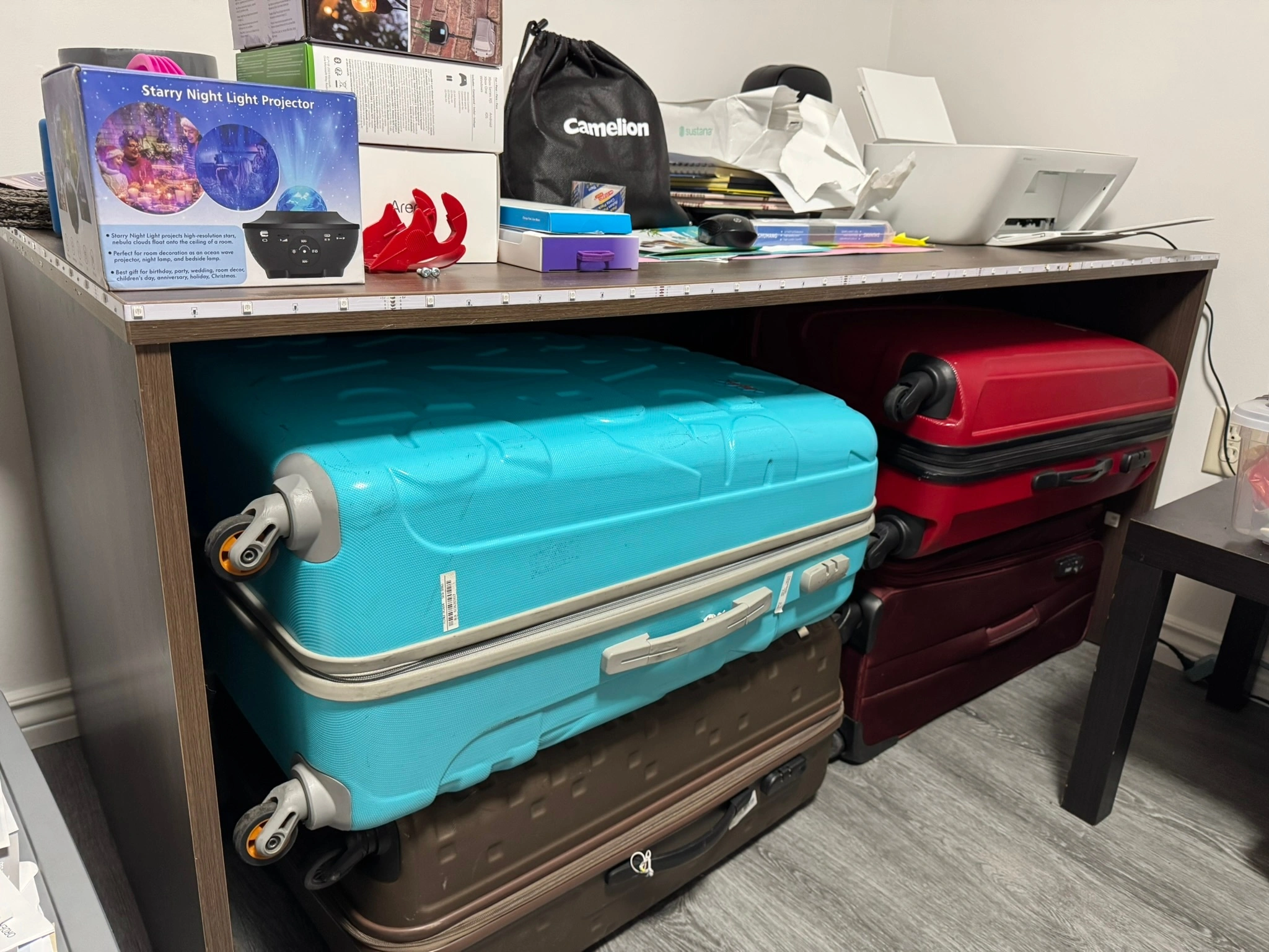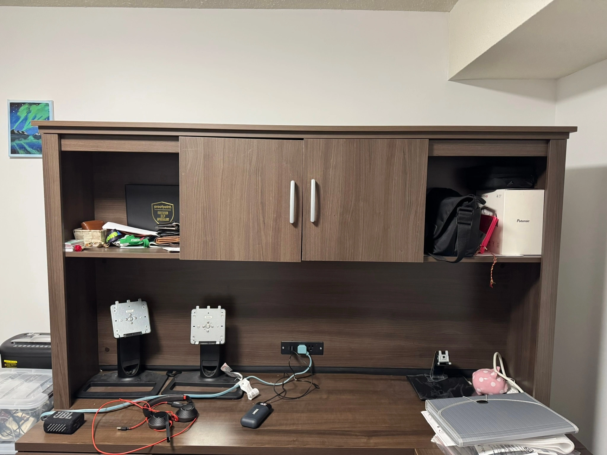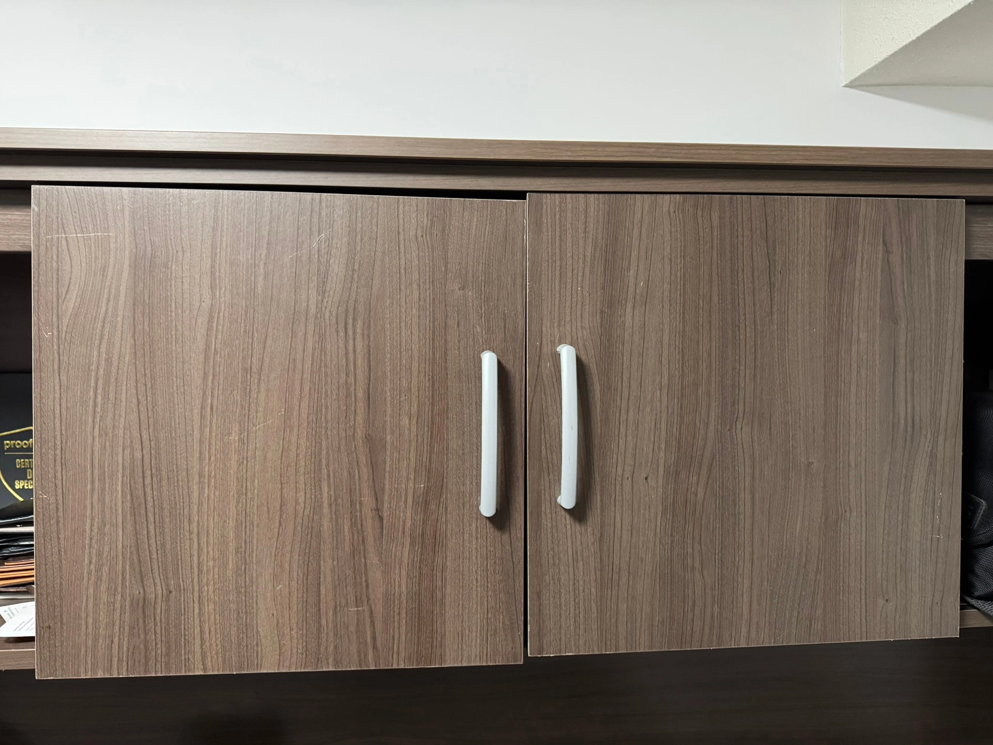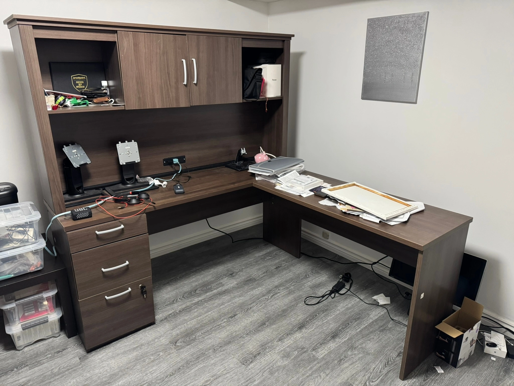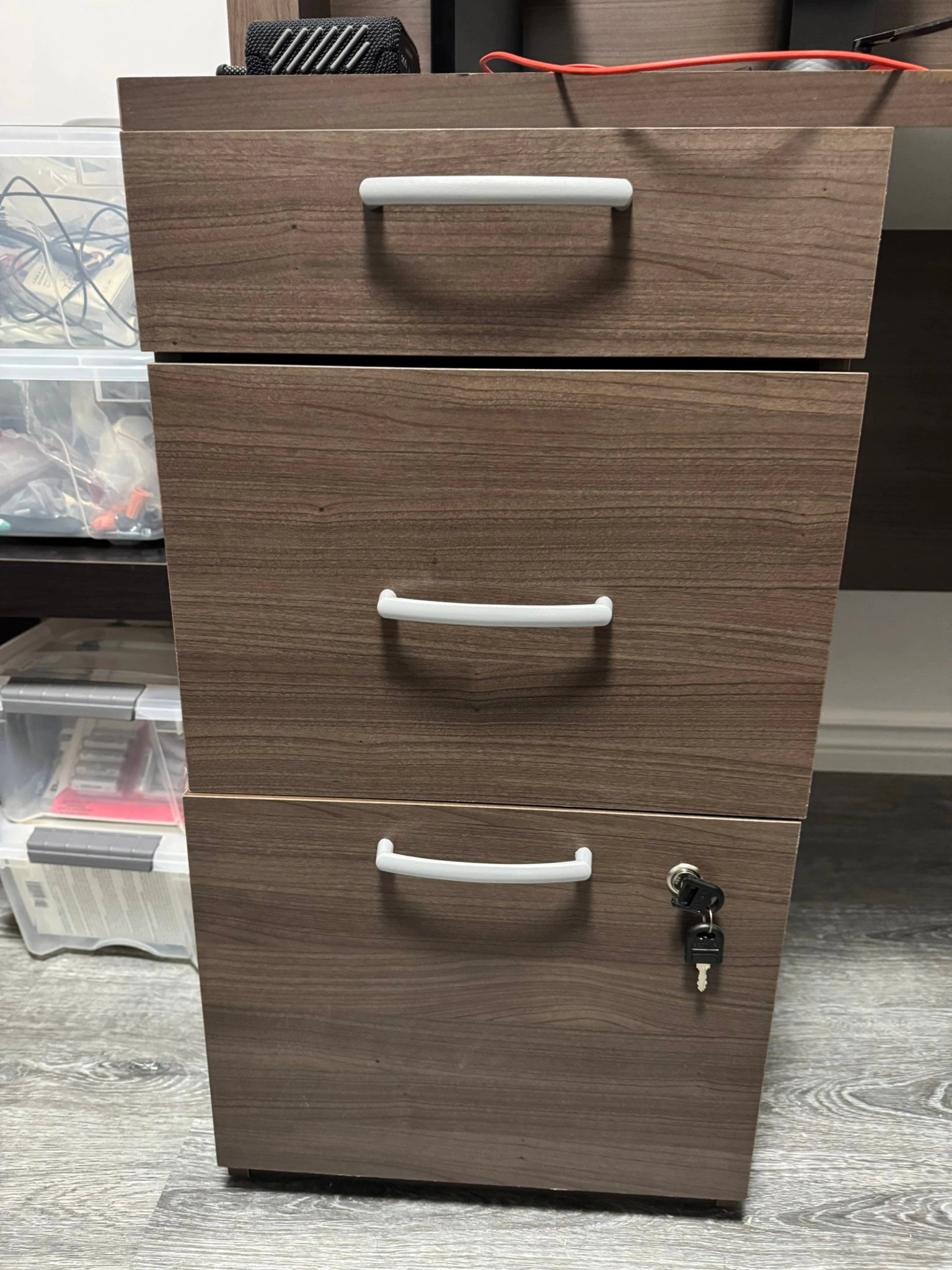 1 box drawer on ball-bearing slides to store small office supplies and 2 closed storage areas to hold larger items.
