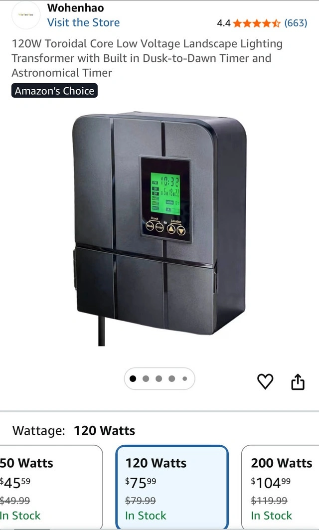 120W Toroidal Core Low Voltage Landscape Lighting Transformer with Built in Dusk-to-Dawn Timer and Astronomical Timer. 5 VERSATILE MODES: on, off, timer, auto (dusk-to-dawn), sunwise (local sunset and sunrise). Load icon shows on screen, blinking reminder when overload. The total power of the landscape lighting fixtures should not exceed 90% of the power pack’s capacity.
