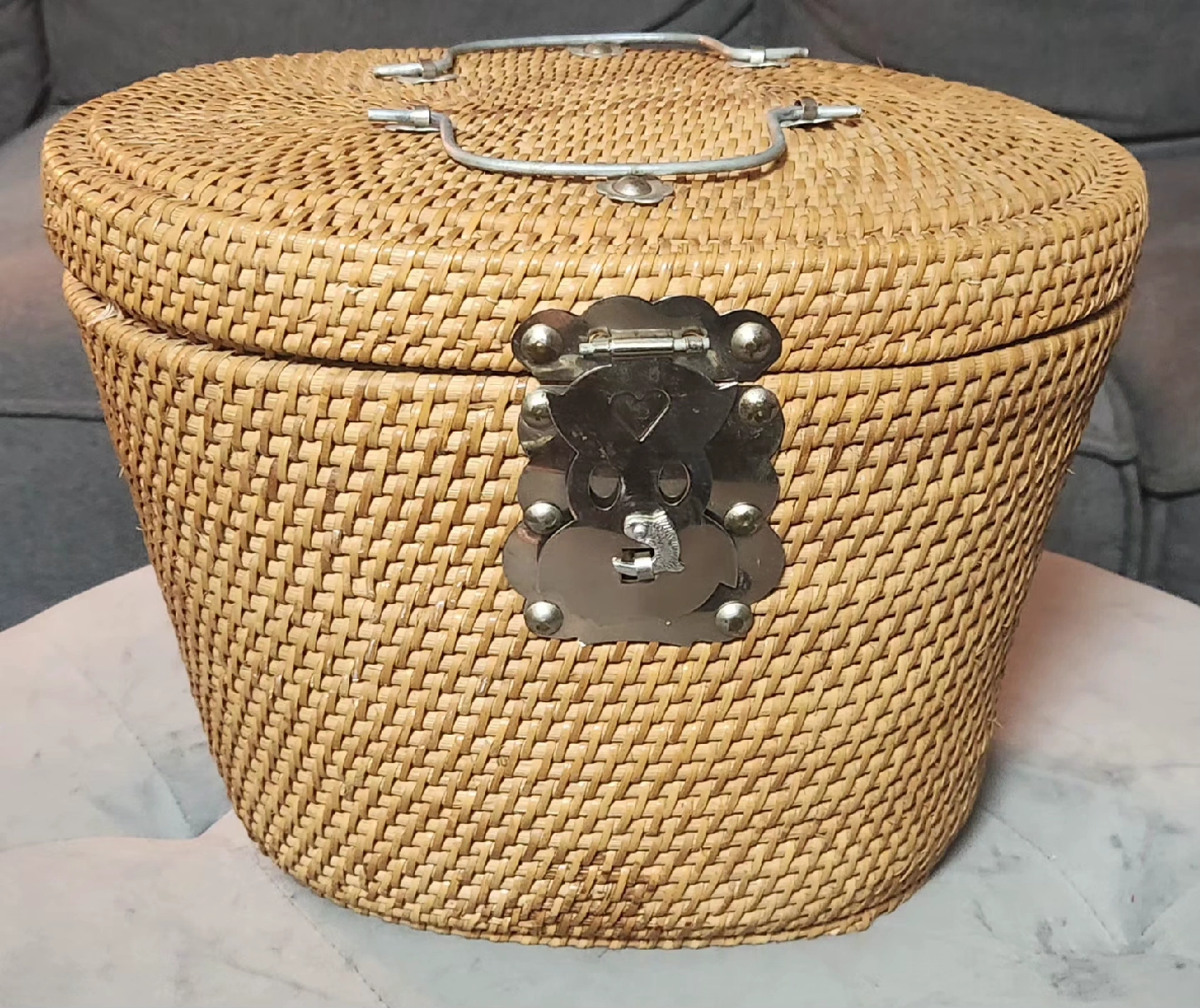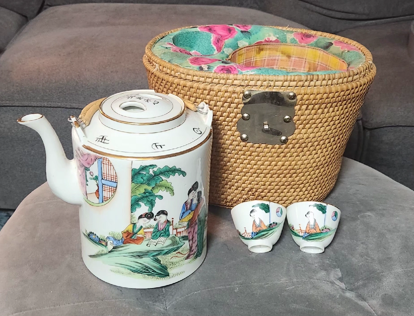 Vintage Asian-style tea pot set that will make a unique addition to any tea lover's collection The set includes a tea pot, two tea cups, and insulated wicker carrying basket with decorative metal closure. The tea pot and cups feature colourful traditional Asian designs. Good overall condition with the exception of a chip in the top of the teapot (see photos) but this won't affect the tea brewing or serving functions. The basket has some minor stains on the inside as well.