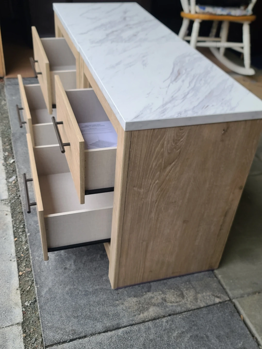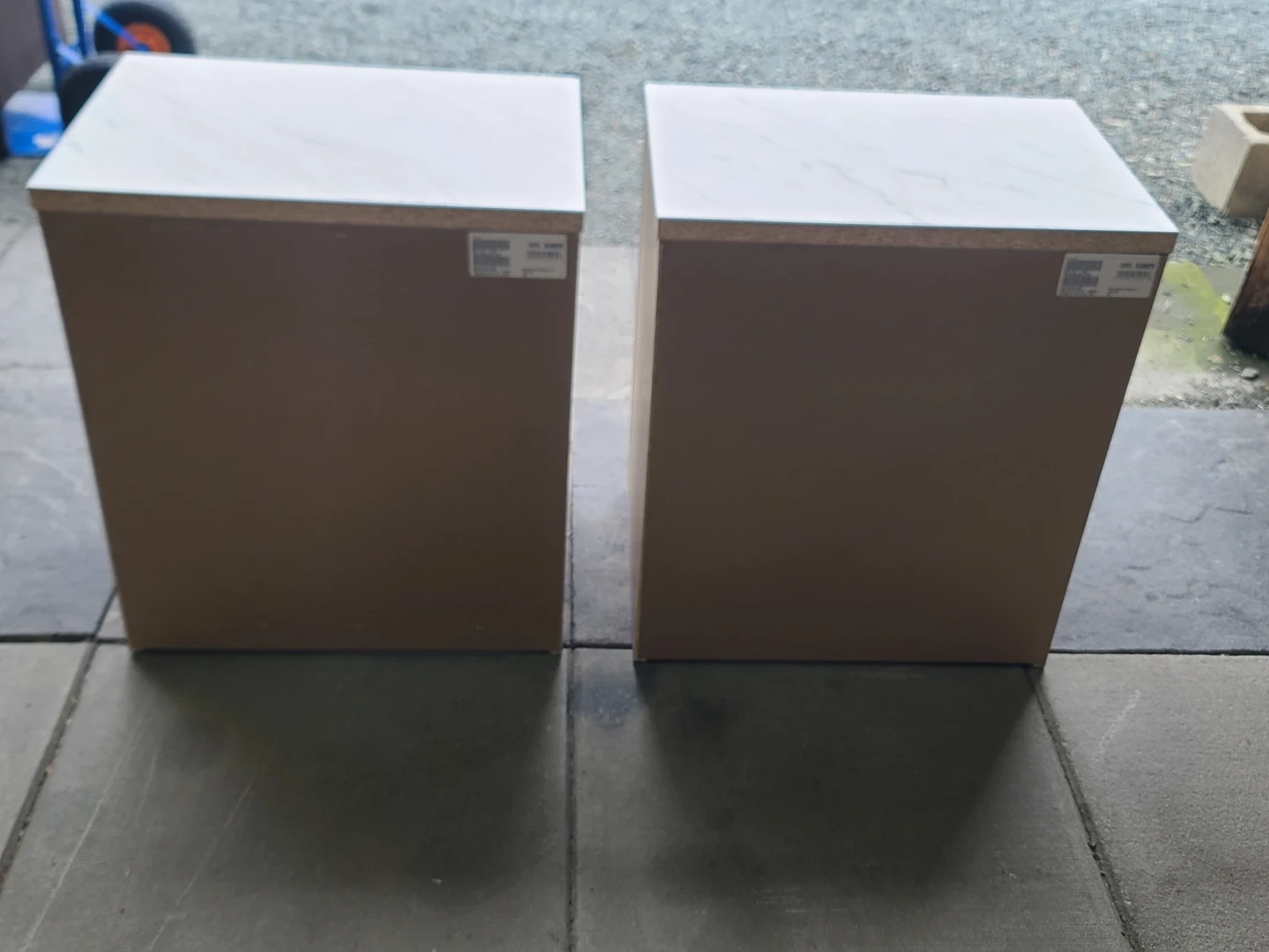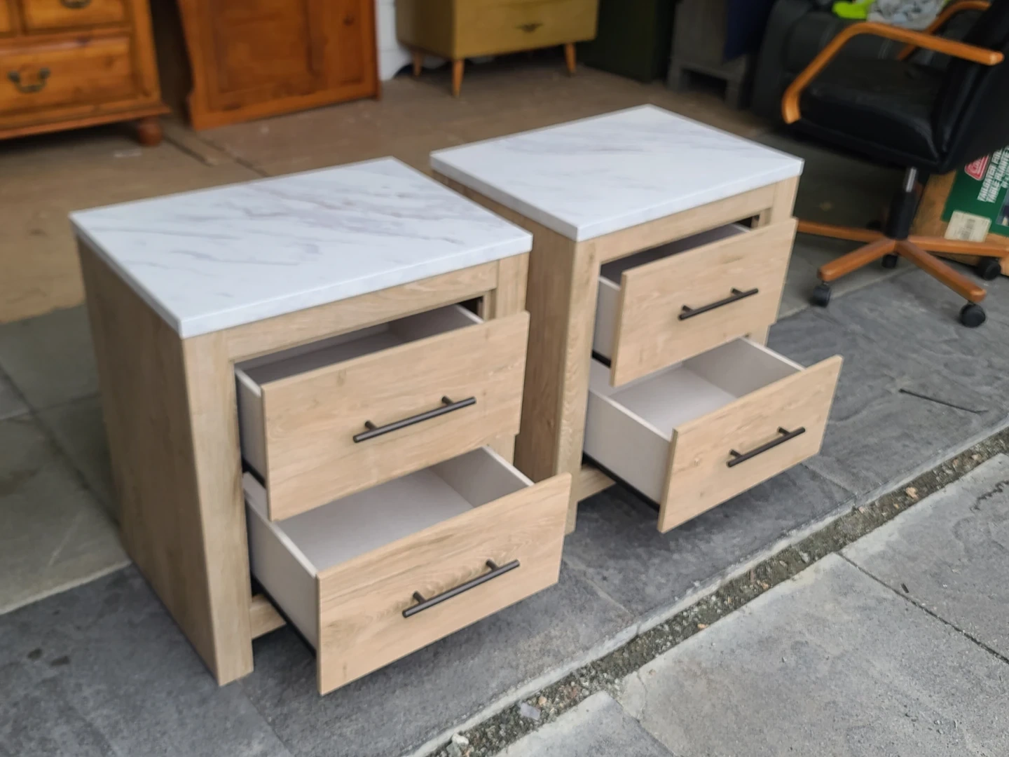 Two matching nightstands with light wood grain finish and white marble-look tops by Ashley Furniture. Each unit has two drawers with black handles. Drawer interiors are light coloured. Measurements: 22" across the front by 16" deep by 25" high. Delivery can be arranged. Viewing and pickup by appointment.