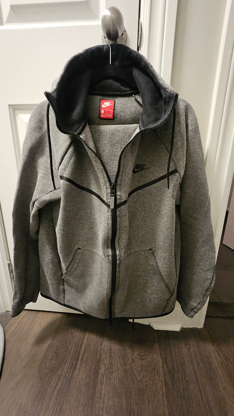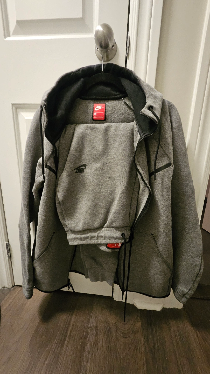 Grey tech fleece set. Includes a jacket and pants. Black drawstrings and zippers. Relax in this soft set after a long day.