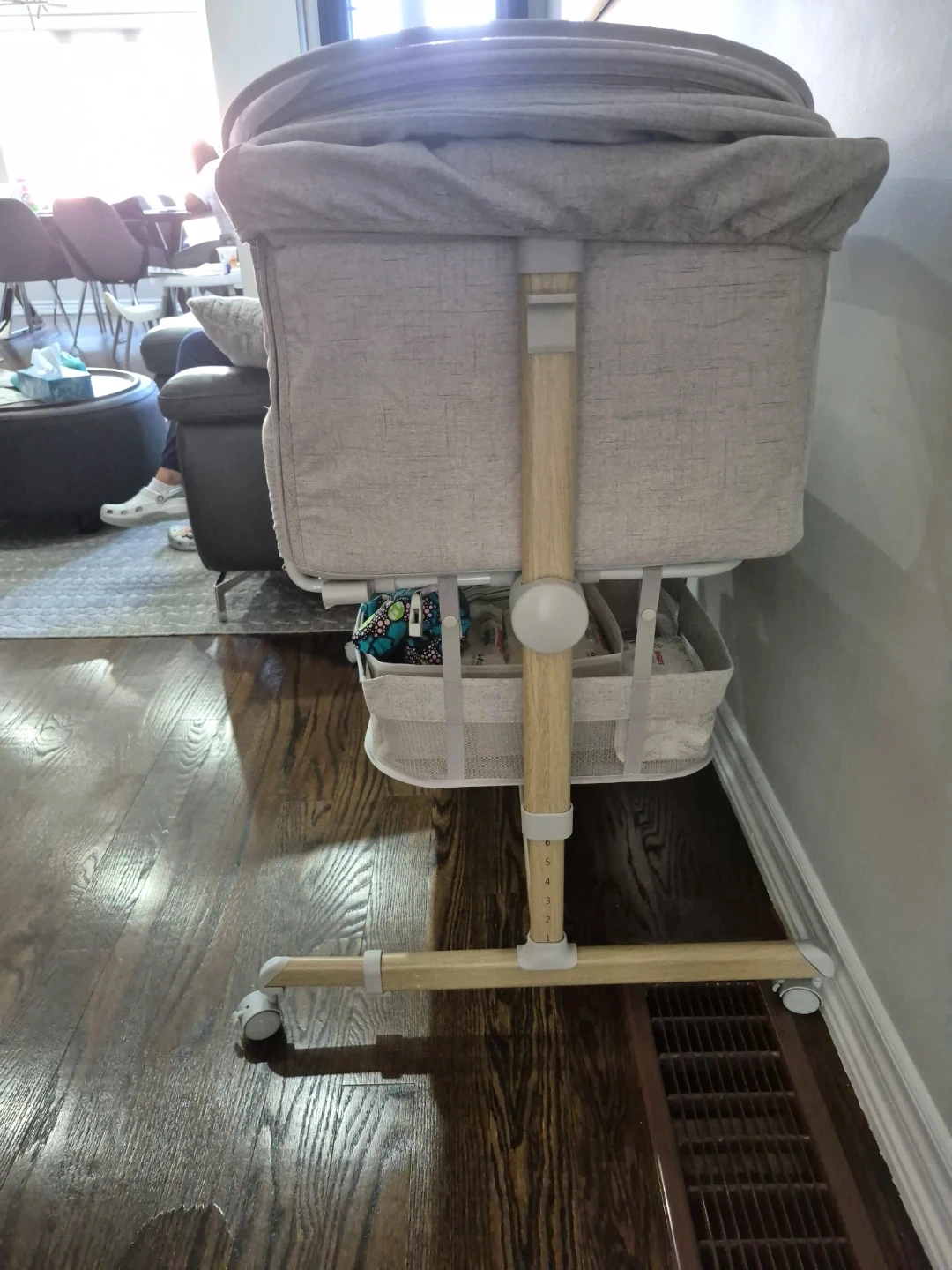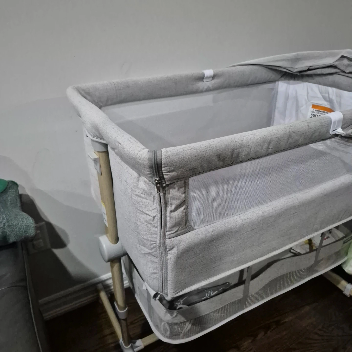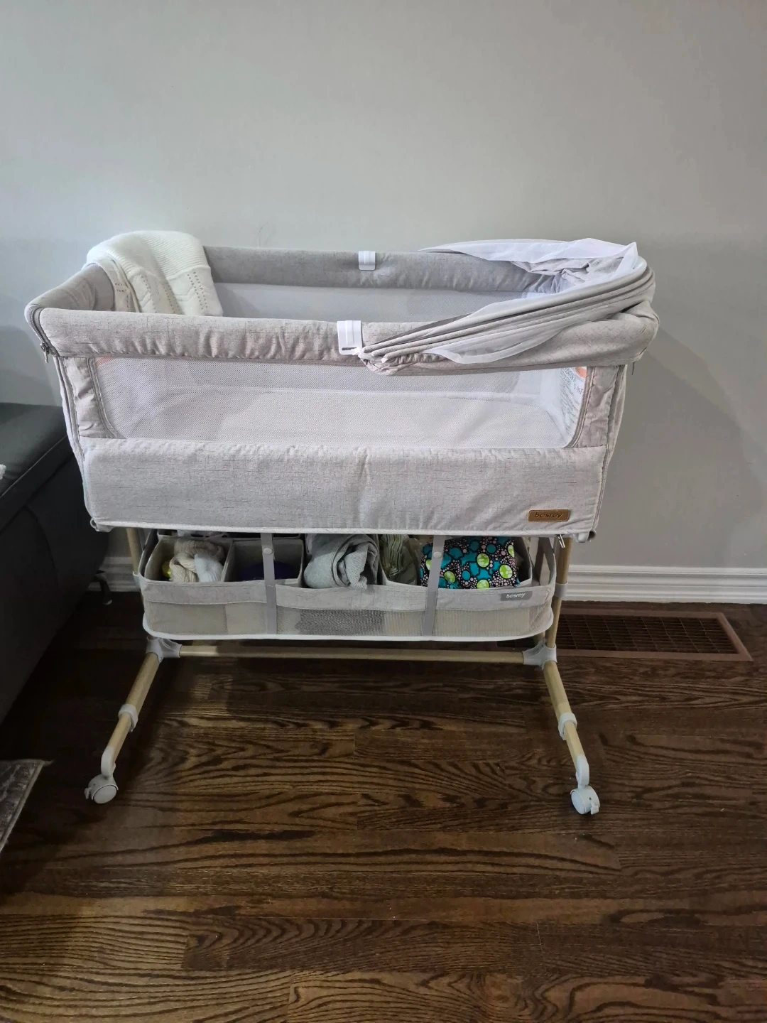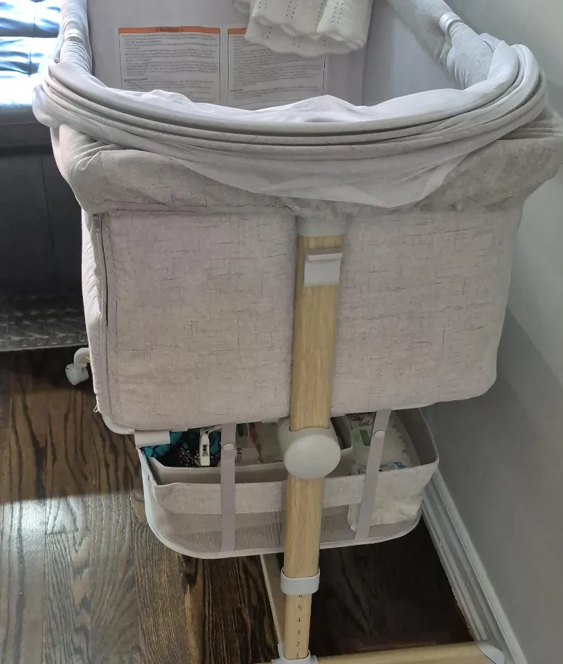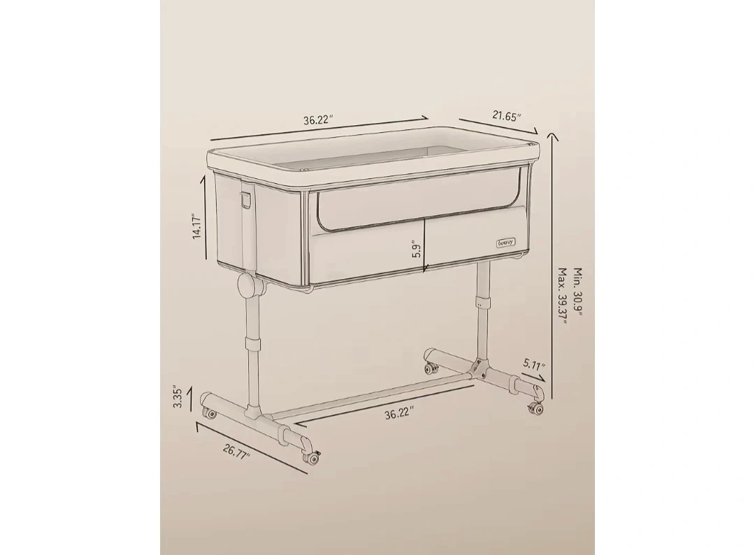 This bedside bassinet offers convenience for parents. It features a mesh side for visibility and a storage organizer underneath. The height is adjustable from 30.9" to 39.37". It's easy to move with wheels.