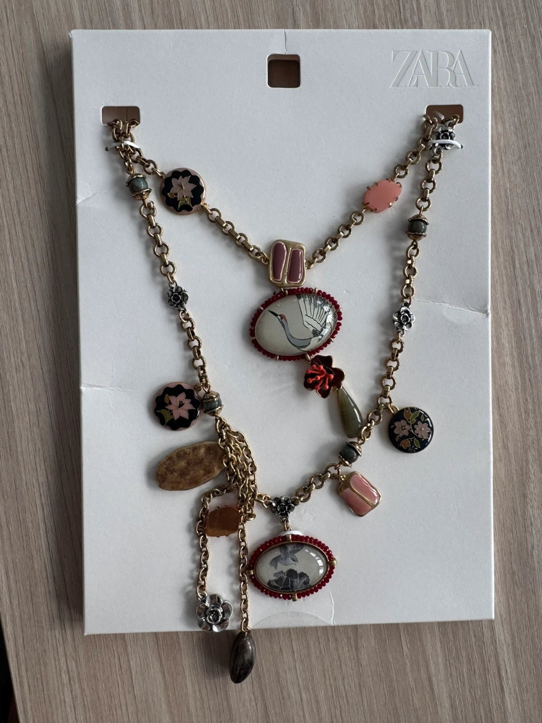 A multi-strand necklace featuring decorative charms and a central pendant with a crane design. Includes a ZARA drawstring pouch for storage. Great for accessorizing outfits. New and never used