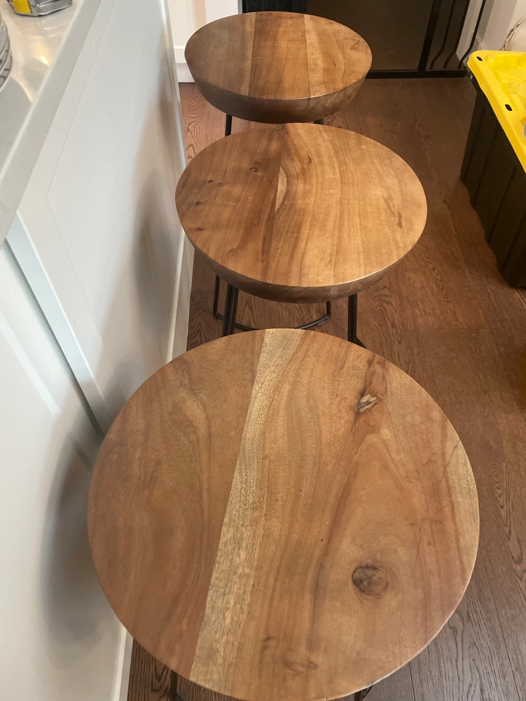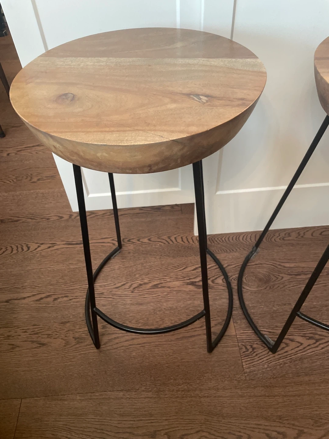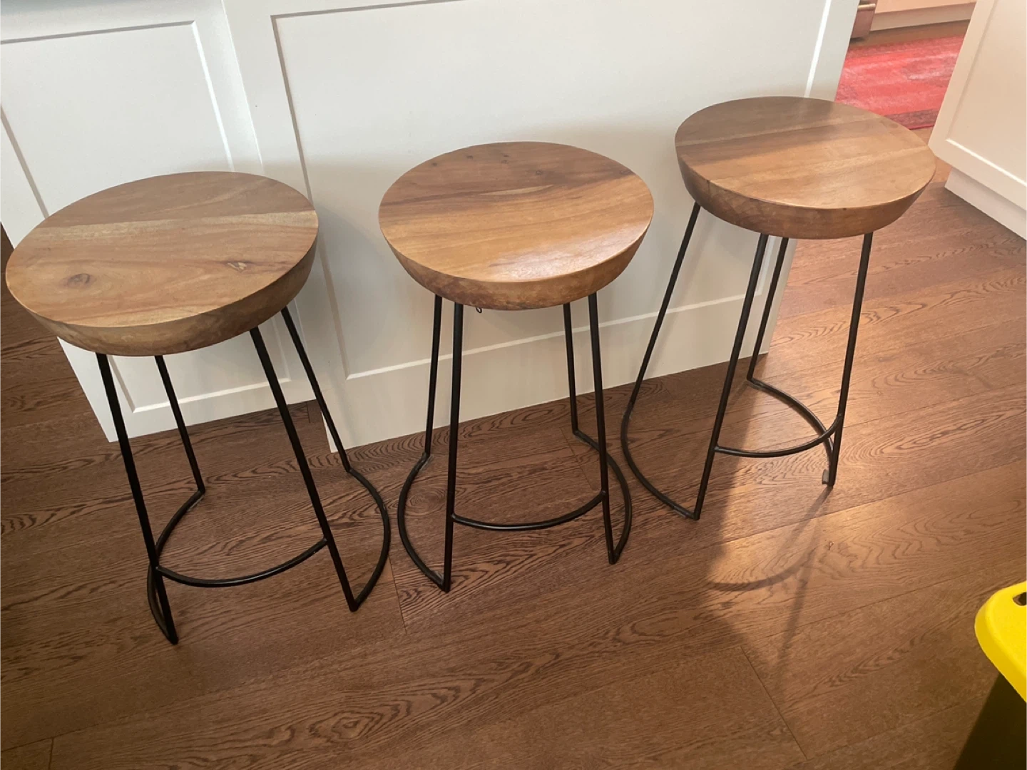 Selling a set of three bar stools. They have a wooden top and black metal legs. Great for a kitchen island or bar area! They are in good condition and ready for a new home