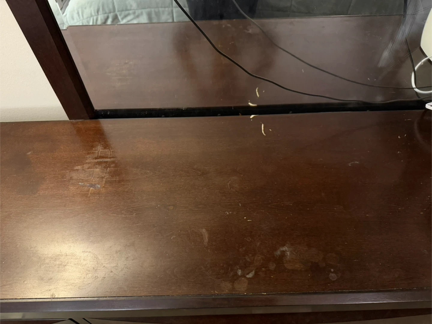 Dark brown wooden dresser with a large mirror attached. Includes a smaller matching nightstand with two drawers. Some wear and tear visible on the dresser top.