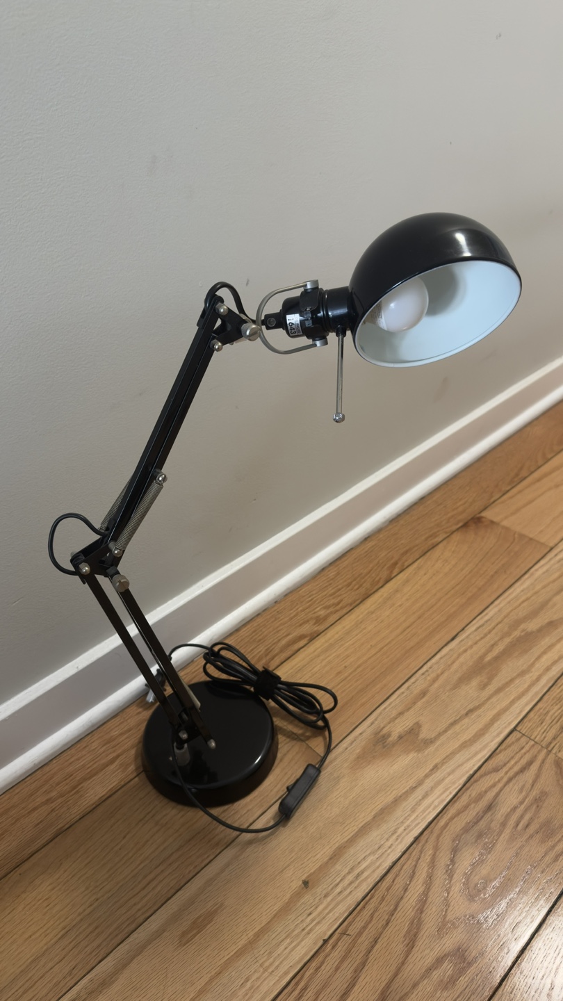 This is a classic black adjustable desk lamp. It has a flexible arm and head for directing light where you need it. It's great for a desk or workspace!