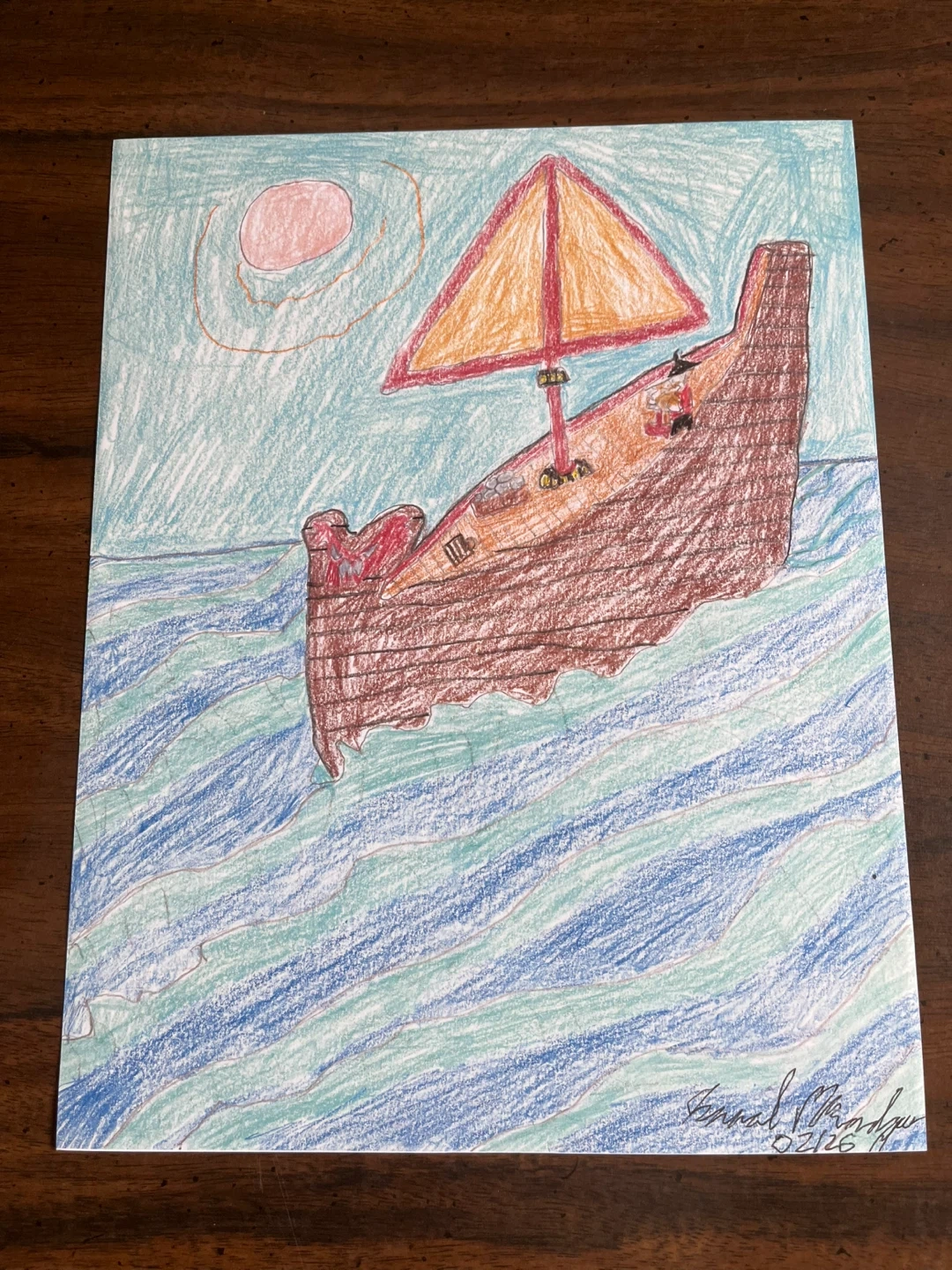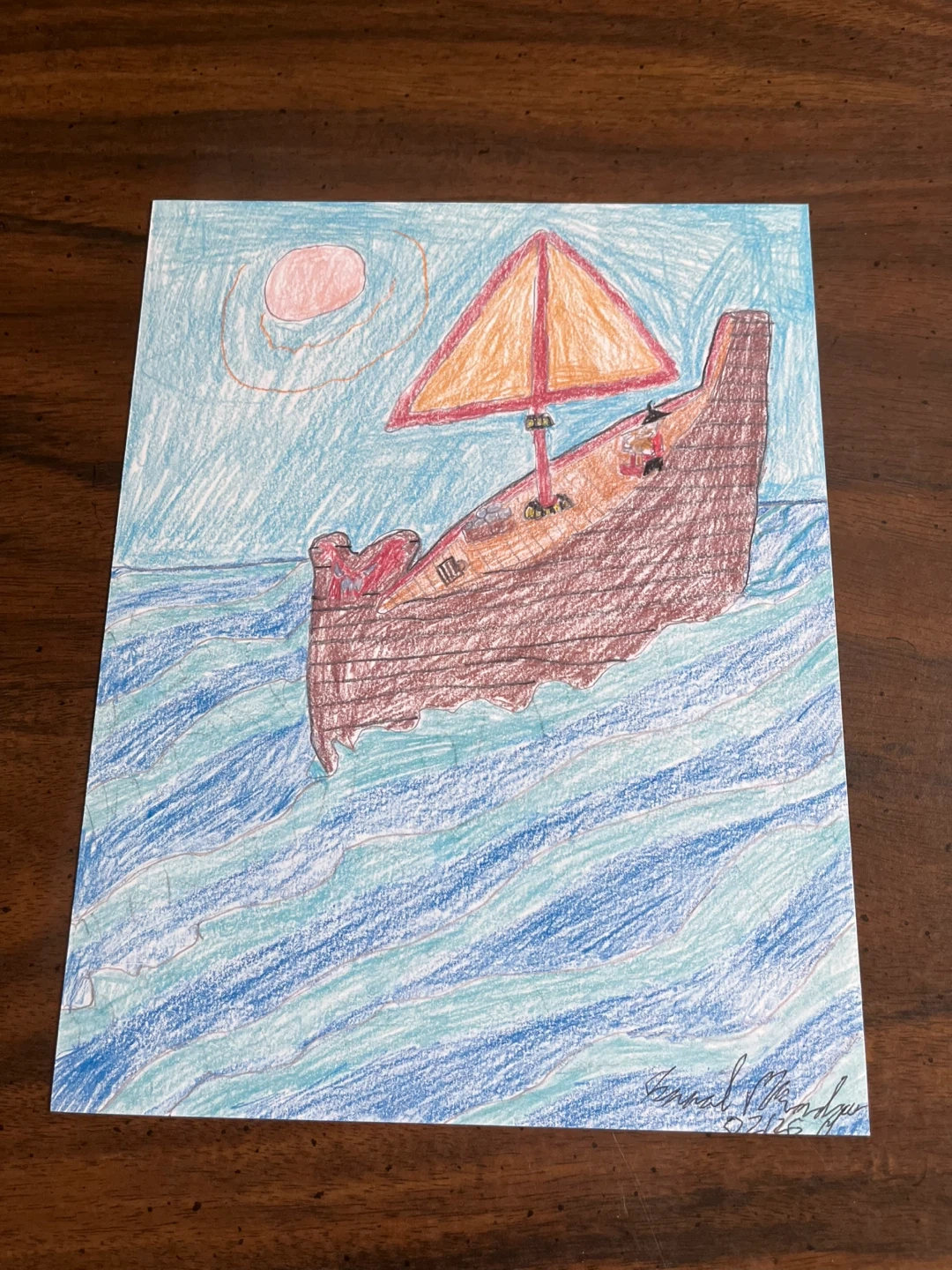 A coloured pencil drawing depicts a sailboat on wavy blue waters under a light pink sun. The drawing shows a detailed wooden ship with a triangular orange sail. It's signed by the artist at the bottom right. This is a unique piece of art! Dimensions are 8.5”x11” printed on your choice of cardboard print paper or print paper. Shipping would cost $6.00 extra.