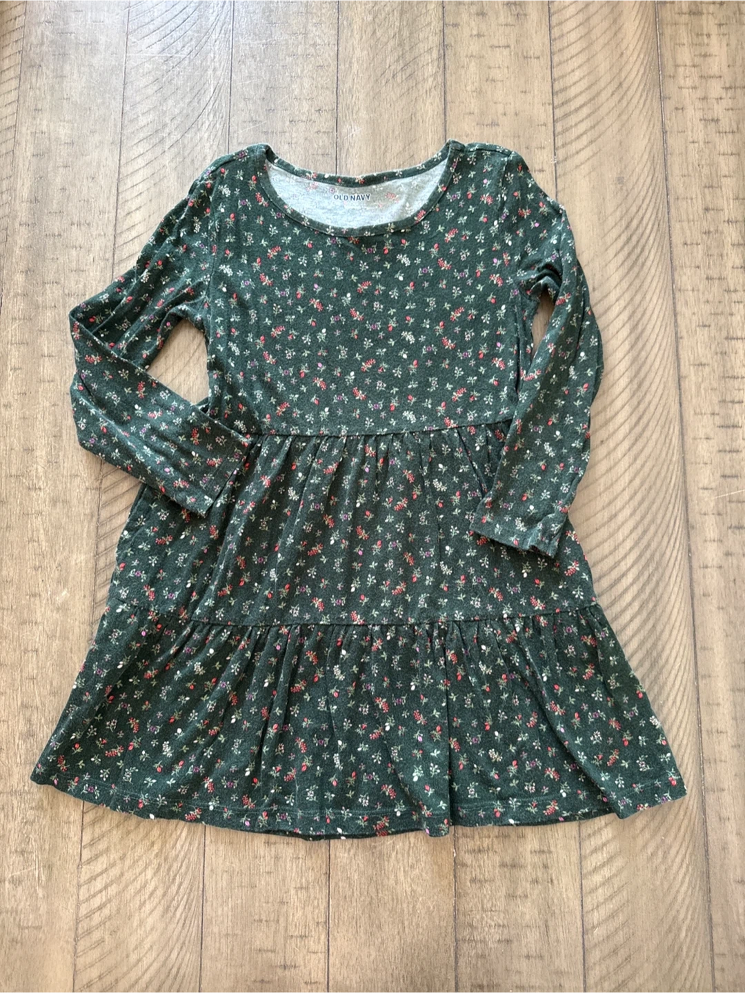 Old Navy long-sleeved tiered dress in a green floral print. It features a round neckline and a comfortable, flowy silhouette. Perfect for everyday wear!