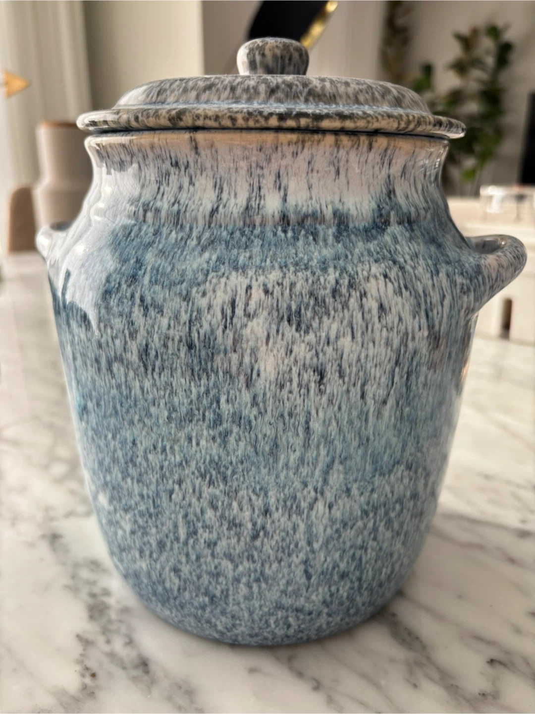 This is a blue speckled ceramic jar with a lid and two handles. Its speckled finish gives it a unique look. This decorative jar is great for storage or display on a shelf.
