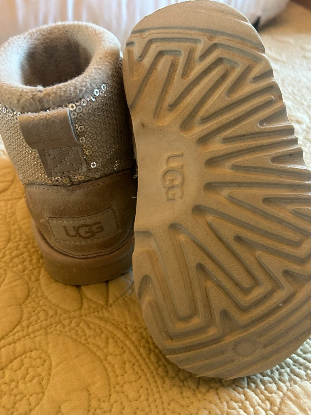Sparkly UGG sequined mini boots for kids. These cozy boots are a size 8. They feature a soft lining and sequined exterior.