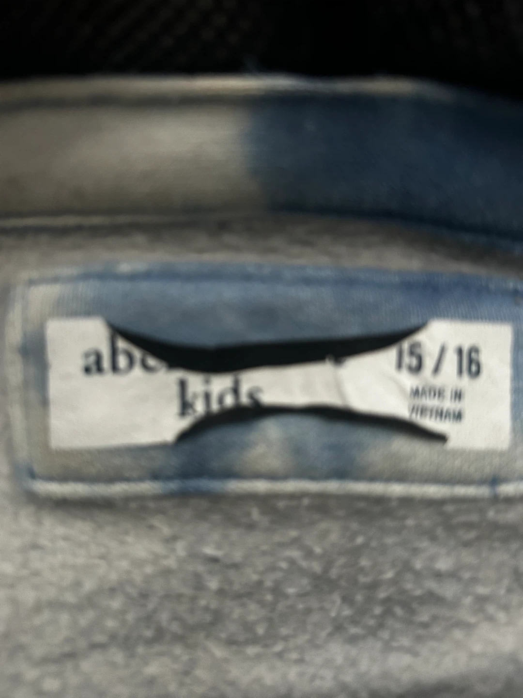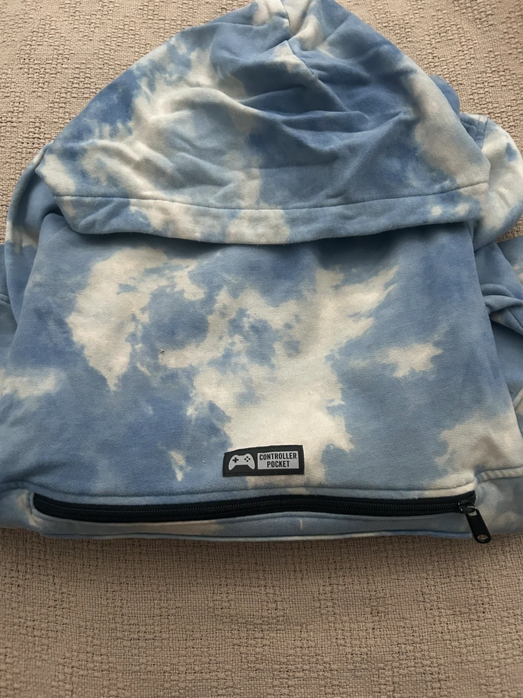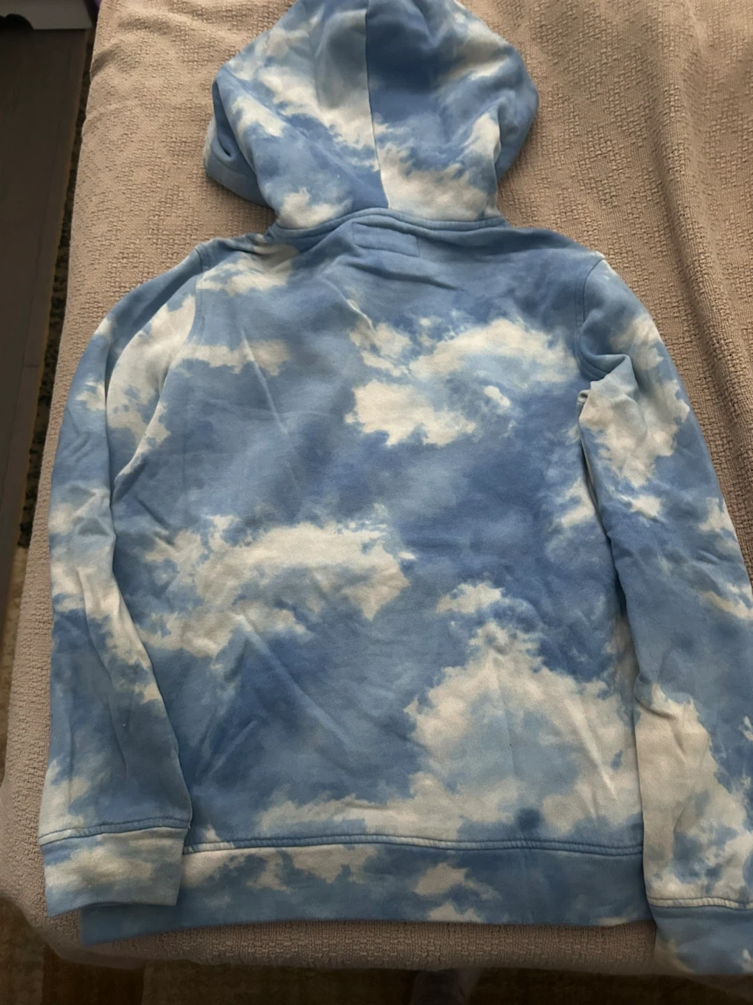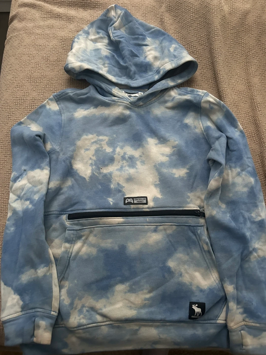 Abercrombie Kids hoodie featuring a blue and white cloud print. It has a front kangaroo pocket and a zippered "controller pocket". Made in Vietnam. Size 15/16.