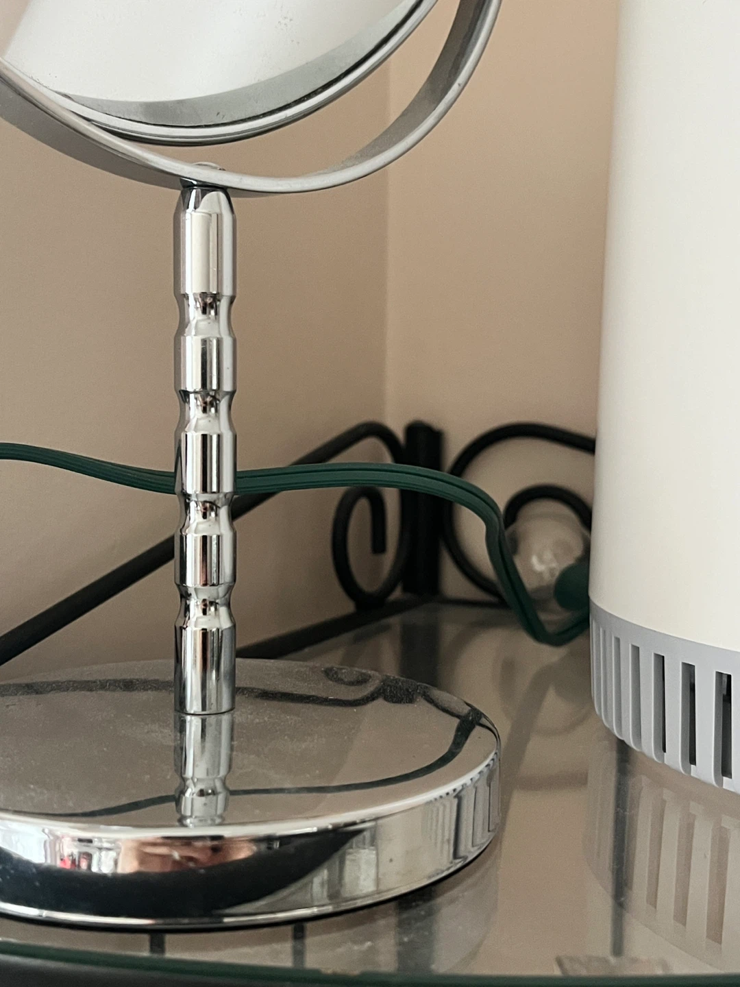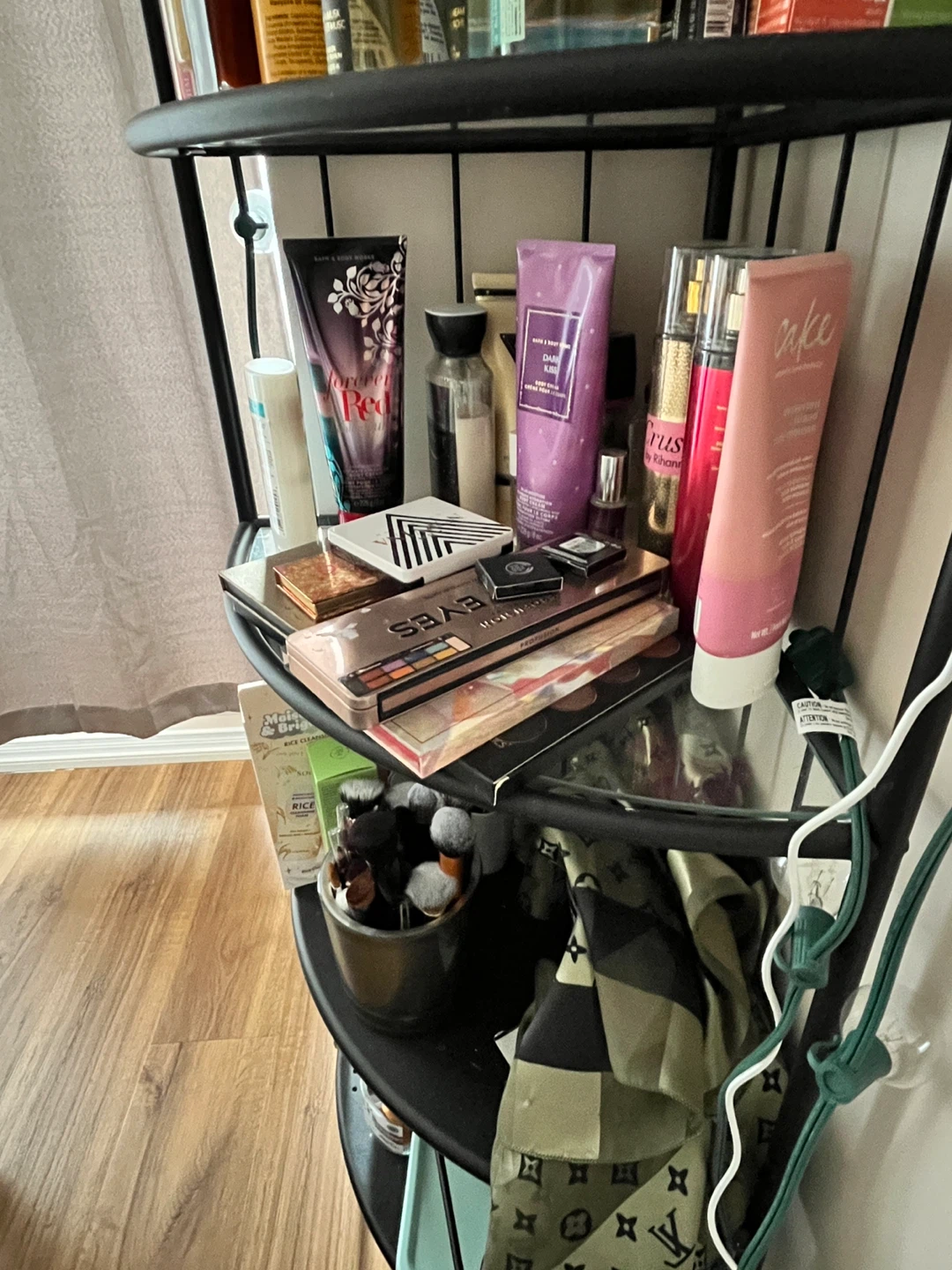 Corner shelving unit in black metal with glass shelves. Okay condition. One of the decorative things at the top broke during last move (see pic).