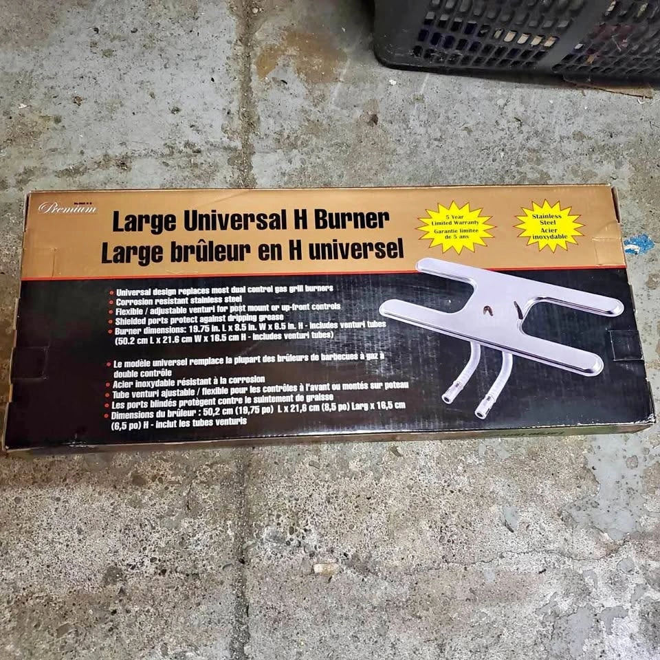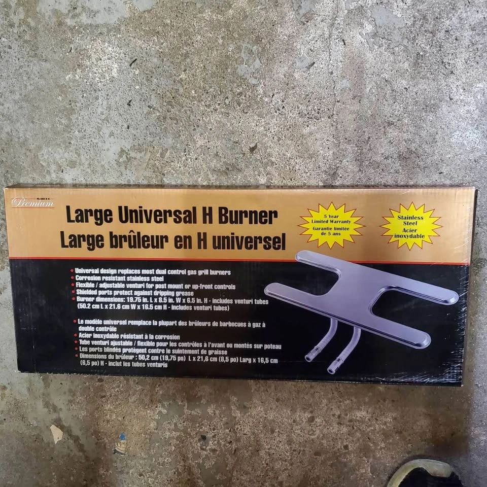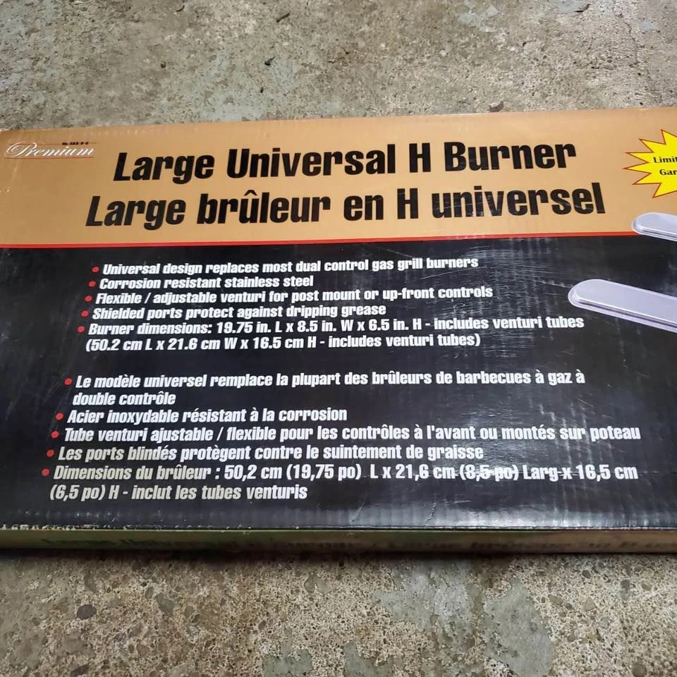 Upgrade your grill with this Premium Large Universal H Burner, designed to replace most dual control gas grill burners! This burner is brand new in the box and features corrosion-resistant stainless steel and a flexible/adjustable venturi for post mount or up-front controls. Shielded ports protect against dripping grease, ensuring long-lasting performance. Fits burner dimensions: 19.75 in. L x 8.5 in. W x 6.5 in. H, including venturi tubes. It's the perfect addition to get your BBQ ready for your next outdoor party!